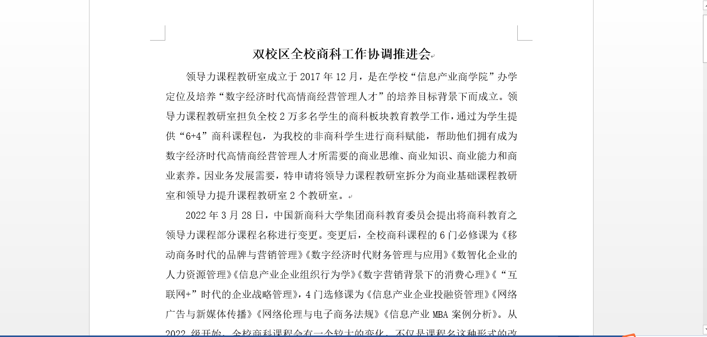 会议包括三个部分。首先,范院长介绍了领导力课程教研室的成立背景、发展过程和改革方向,并介绍了中国新商科大学集团商科教育委员会于2022年3月28日提出将商科教育之领导力课程部分课程名称进行变更的基本情况。作为为全校2万多学生提供商科教育的师资队伍,更应该在课程建设、课程融合、课程实践上多下功夫。从2022级开始,全校商科课程会有一个较大的变化,不仅是课程名这种形式的改变,更重要的是要深挖全校商科教育,立足信息产业、企业的需要,进行创新性、实用性改革。