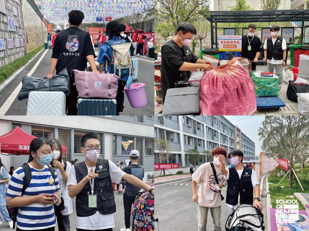 最令人感动的是穿插在迎新现场的 “黑马甲”志愿者们,一次次微笑说着“你好”,手中接过大包小包的行囊,四处忙碌奔跑的身影,滚落脸颊的汗珠,坚守岗位的工作态度,无一不体现戏剧影视学院对萌新们最真切的欢迎。