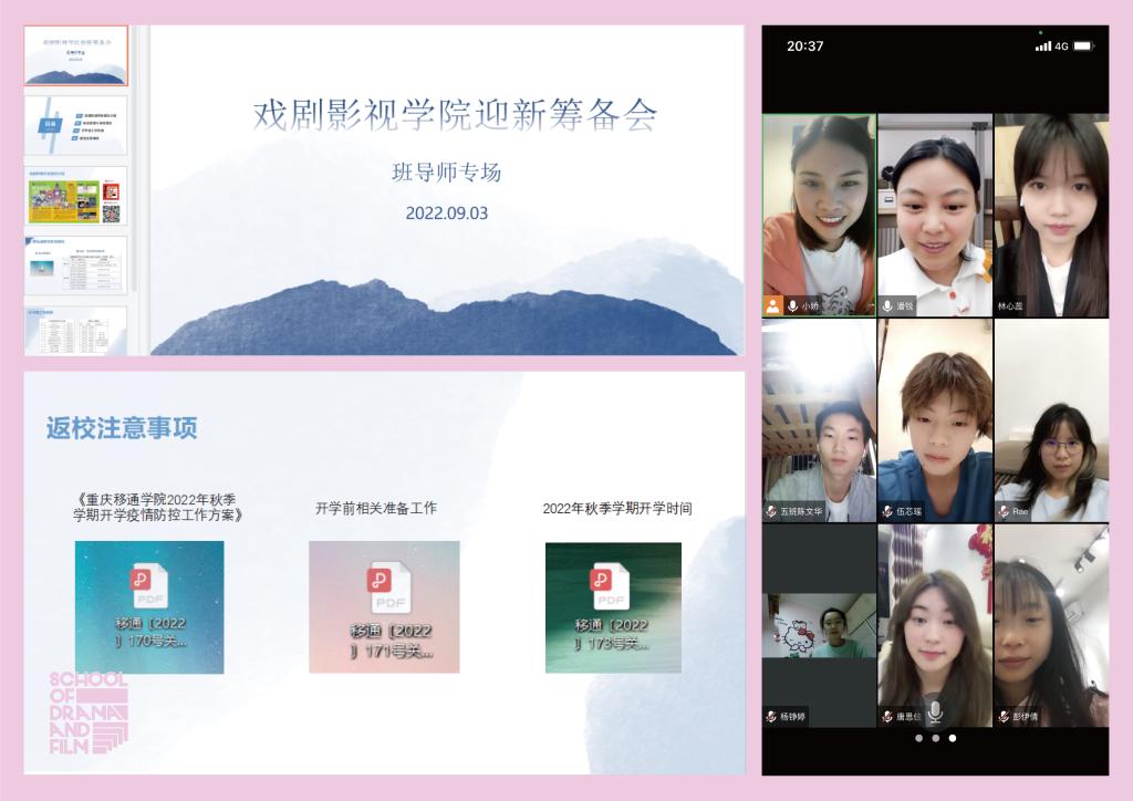 9月3日,戏剧影视学院线上开展了2022级迎新筹备会——班导师专场,会议由学院学工办主任曾玉娇老师主持。曾老师从学院情况介绍、新生录取和班导师带班明细、开学前工作安排和返校注意事项四个方面向班导师做了详细说明,对新生入群管理、疫情打卡以及新老生防诈等问题进行重点强调;辅导员潘锐老师对新生问题答疑进行举例分析,提醒班导师们耐心、细心解答新生困惑,正面引导新生提前了解大学生活,帮助扣好新生大学四年的第一粒扣子;班导师也就新生入群后各项问题进行讨论和解决。迎新工作关系到大一新生对大学生活的第一印象,是学院工作的重中之重。