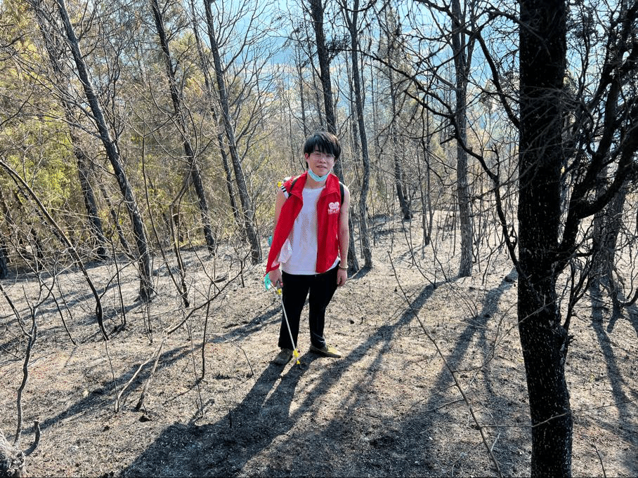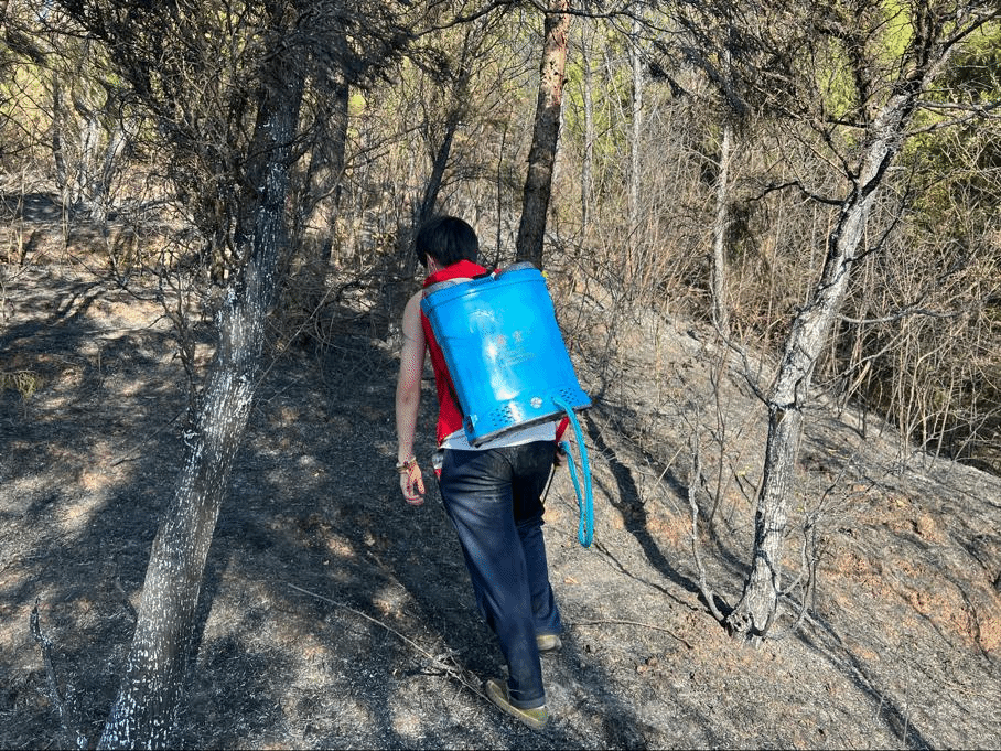 森林火灾发生后,往往有余火,如果复燃灭火成果将功亏一篑。2021级数据科学与大数据技术专业的周祖航同学,看到曾经美丽的缙云⼭已经伤痕累累,山火过后毅然决然报名志愿者前去清理救援现场和清理余火。背着行李,70°的⼭坡,踩着尘土,汗水淋湿衣衫,但他能够为山火清理贡献力量,脸上依旧挂满笑容。从山脚到山顶,从白天到深夜,24小时的巡逻坚守,面对满目疮痍的缙云山,他相约大家,来年春天,一起到缙云山植树。