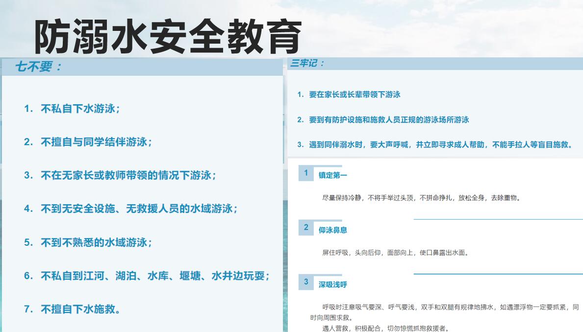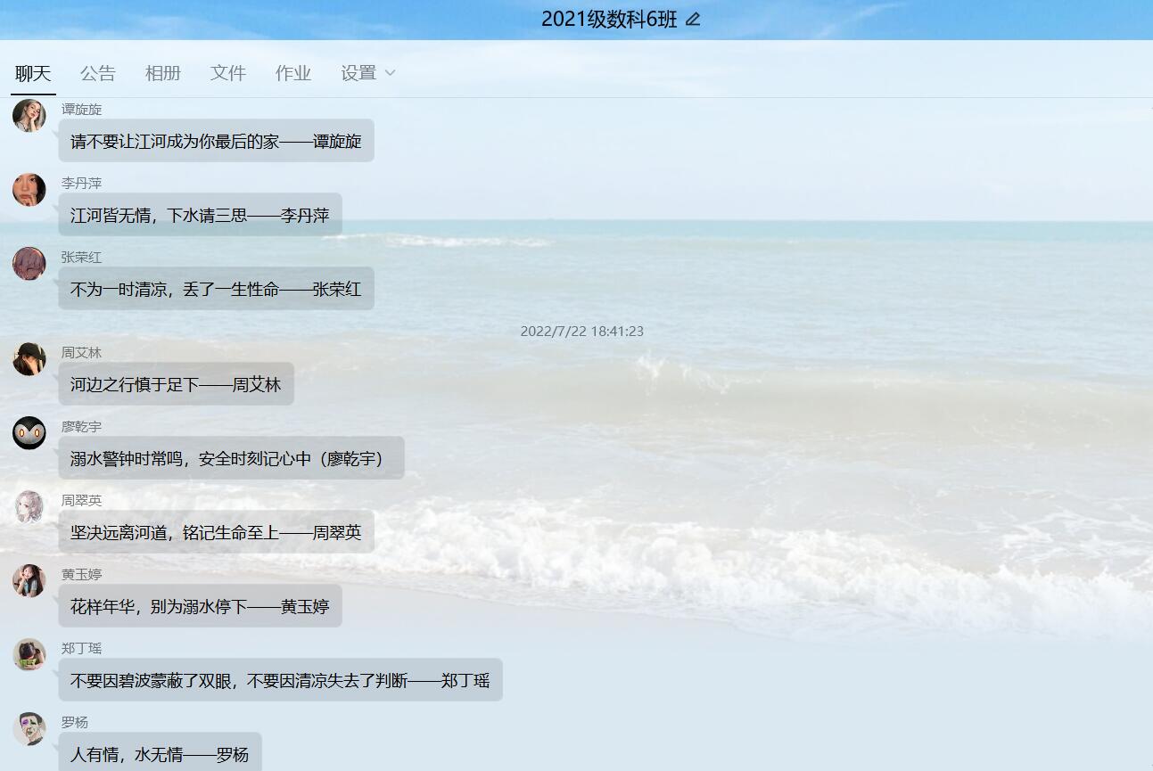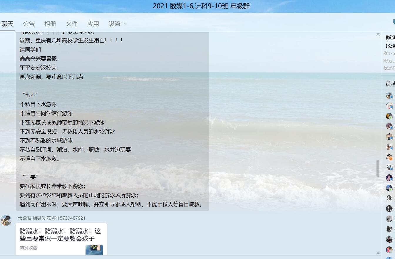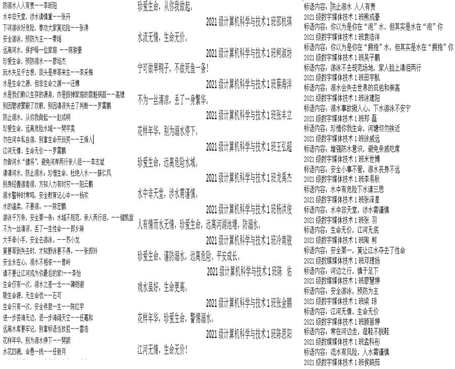 暑假的7、8月,正值高温天气,炎热难当,全国各地的溺水事故时有发生,为进一步增强同学们的防溺水意识,守护自己和家人的生命安全,大数据与计算机科学学院把防溺水安全教育作为专题进行宣讲教育。一方面,全体辅导员通过线上年级会的方式,召开了防溺水主题教育,展示惨痛的溺水事故,用深刻教训警示同学们防溺水,以“七不要、三牢记”要领给同学们提升防溺水意识。另一方面,7月22日至7月26日期间,学院面向全体学生开展了防溺水宣传标语征集活动,邀请辅导员、学生与家长共同联动,商讨后提交一条防溺水宣传标语。活动中,同学们积极参与,充分与家长沟通,保质保量地提交了主题突出、通俗易懂、警示性强的防溺水宣传标语,防溺水观念和意识实现了共同强化。