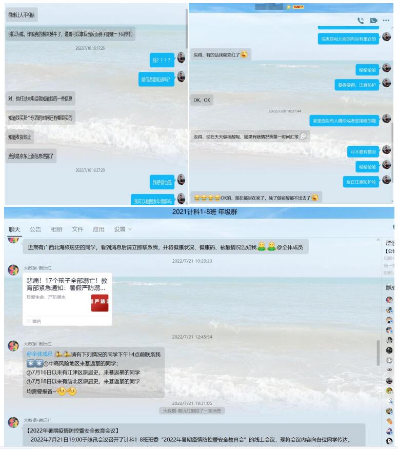 安全教育涵盖很多方面,辅导员们的安全教育也全力拧紧暑期安全阀,教育内容囊括了大多数的安全方面,帮助同学们度过平安、健康、完美的暑期。在疫情防控方面,辅导员们点对点联系涉疫情的同学,送去关心问候,并及时提醒大家,疫情防控形势变化多端,要注意个人防护,减少出行流动,及时就医报备。在防电信诈骗方面,接到预警后,辅导员立即电话联系相关学生进行了解和劝解,向全体学生警示具体案例。除此外,辅导员们还进行了防网贷、警惕网恋、刷单等各类骗局,以及防盗抢、防中暑、防热射病等教育,开展了交通出行安全、意识形态安全、饮食安全、暑假工个人权益保护等宣讲。