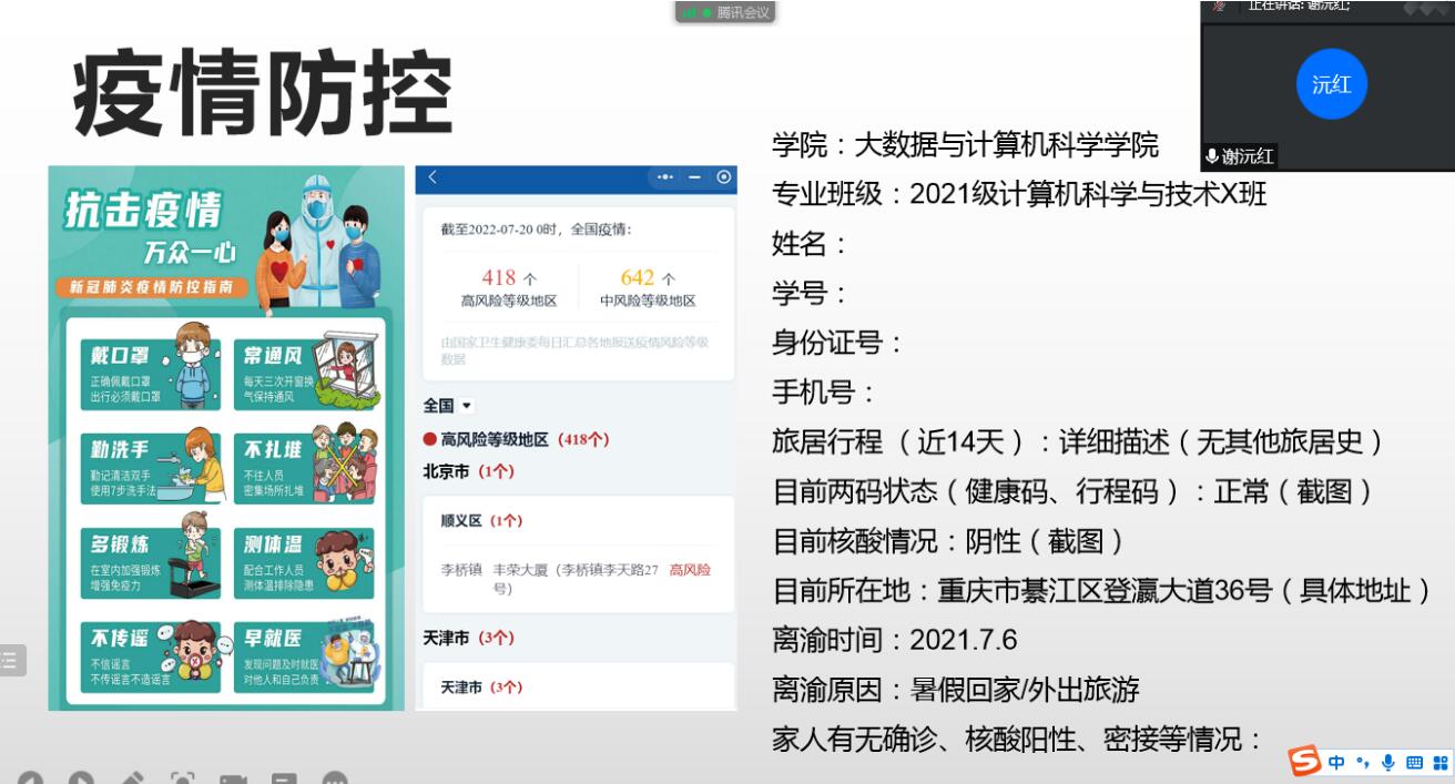 为了让同学们在暑假也能得到安全提醒和教育,辅导员们通过年级群、班级群、班委群、发送短信、拨打电话、私信聊天等方式,转发、通知安全教育的最新政策、经典案例,宣讲各种注意事项,悉心了解、询问和关心同学们的安全情况。同时,全体辅导员还通过腾讯会议的渠道,召开了“大数据与计算机科学学院2022年暑期疫情防控暨安全教育”班委线上会议,并让班委以群接龙或群公告确认等方式,将会议内容精准传达到每位同学,确保每位同学都能知悉和掌握安全教育会议的内容。