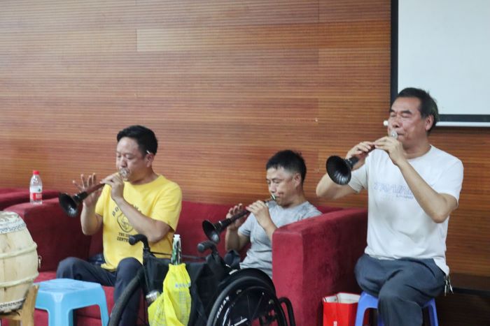 非遗之路漫漫,志愿之精永存心。“金桥吹打”历史悠久,金桥镇也被重庆市文化局命名为“吹打乐之乡”,“金桥吹打”为“巴渝民间十大艺术”之一,2006年入选中国国家级非物质文化遗产。在寻找金桥吹打的途中,横山青年们经过多方打听,得知暂居金桥镇马头桥村的非遗物质传承人都搬离了现居住地,历经多次寻找终于找到马风派金桥吹打第六代传人张登洋老师傅。