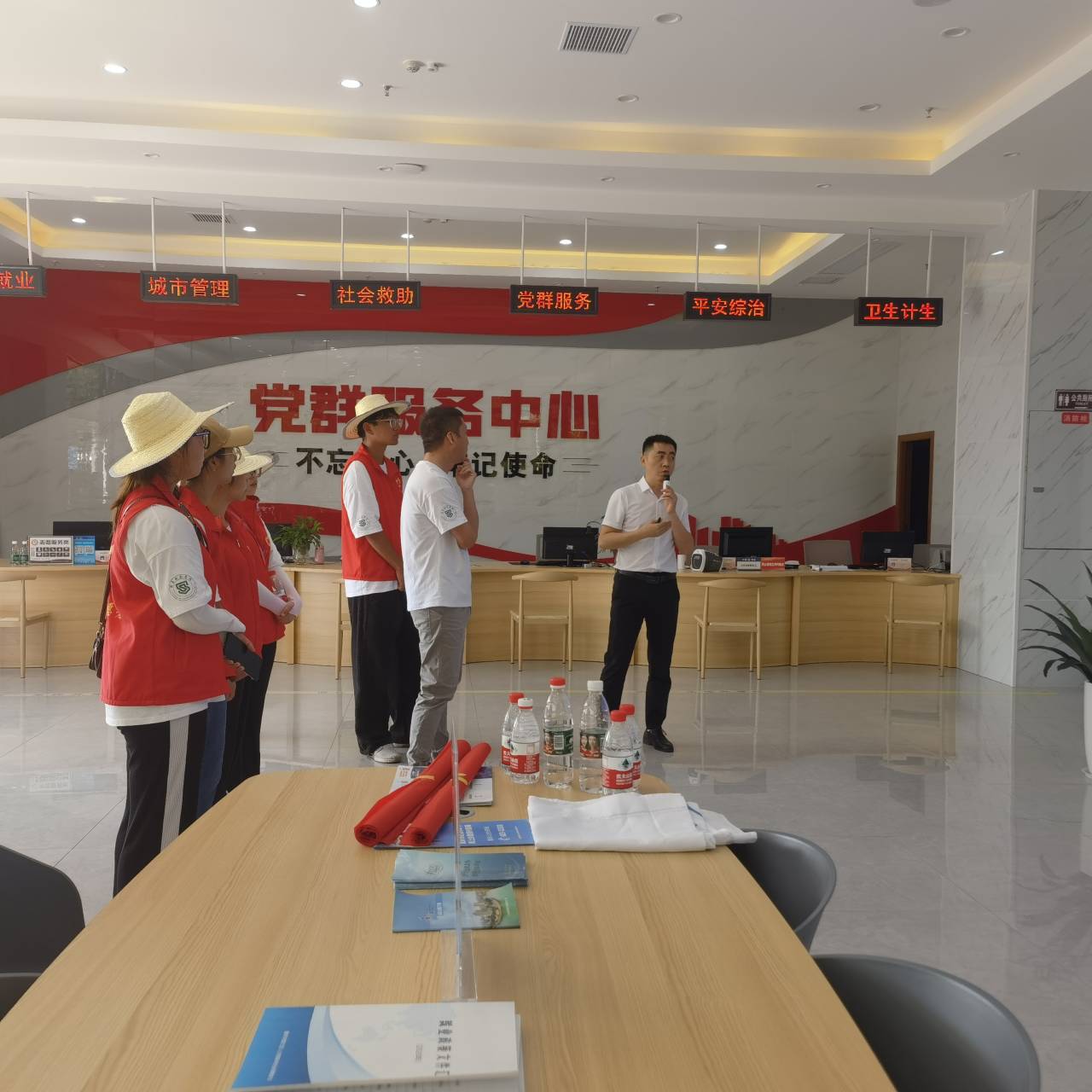 志愿者们刚刚踏入服务中心的大门,踏入大门的瞬间就让人感到眼前一亮,靠门的一个书架上,全是关于党的书籍,还有正前方醒目的标语,以及认真工作的前台文员。