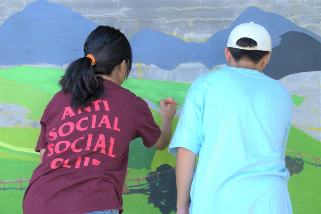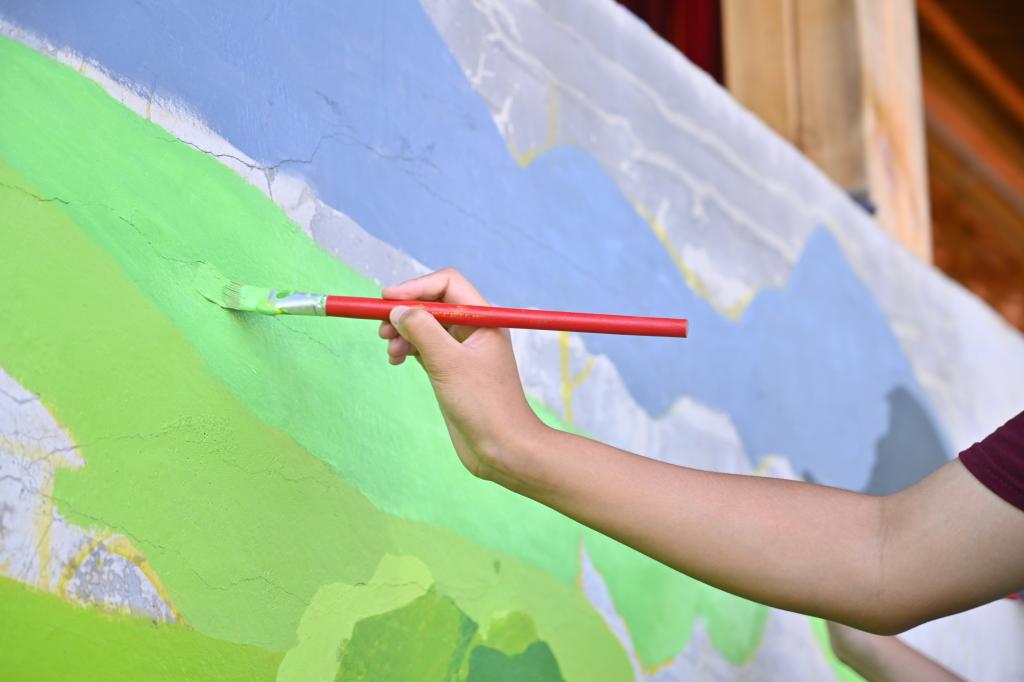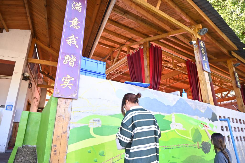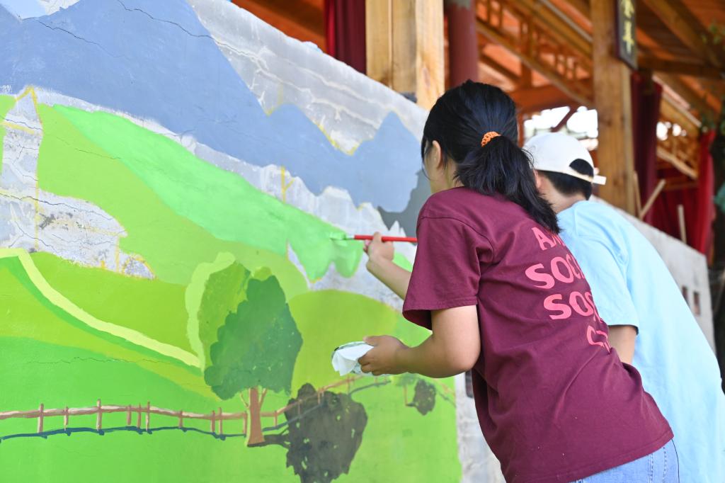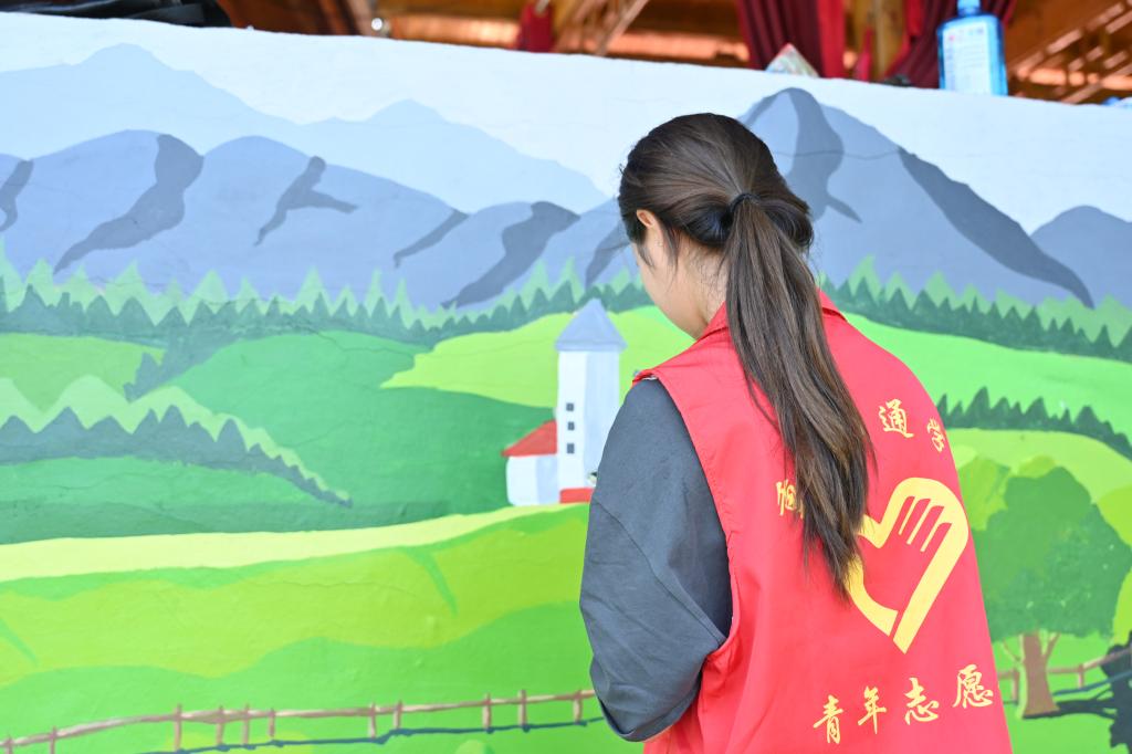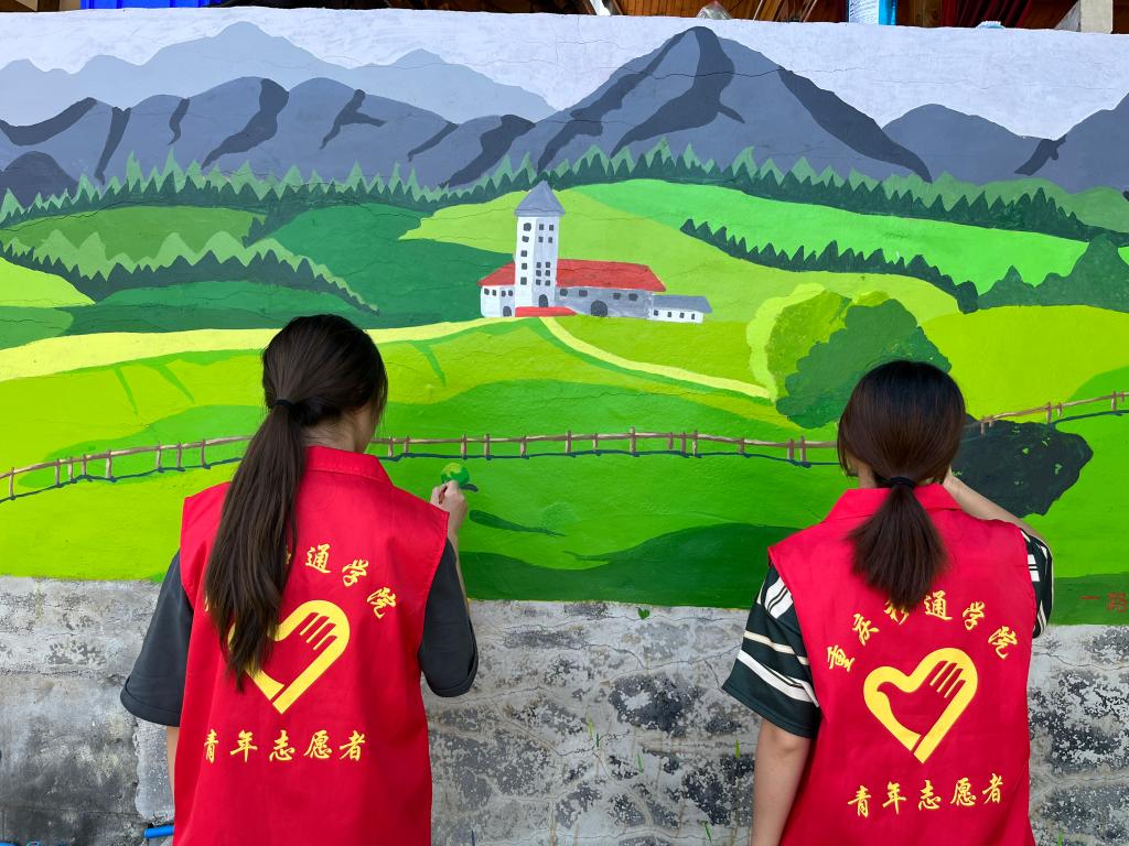 一笔一画描绘的是志愿者们对鱼子村的美好祝福和期盼,一滴一点流露的是志愿者对鱼子村的依依不舍和留念。乡阳小队成员利用自身技能,为村子的发展尽一份力,希望用手中的画笔能够画出最本真的颜色,为美丽乡村建设增添色彩。志愿者们将单调的水泥墙壁变得色彩缤纷、绚丽多彩,改变乡村原始石墙简单的样貌,每一次抬手和落笔都是无比细致,一笔一画间,美丽花卷跃然墙上。同时,结合鱼子村文化特色,更加突出展现鱼子村山水如画的景象,在提升乡村文化艺术气息的同时也对外吸引广大游客的注意,促进乡村旅游产业新场景普及发展,以第三产业带动新农村经济发展。