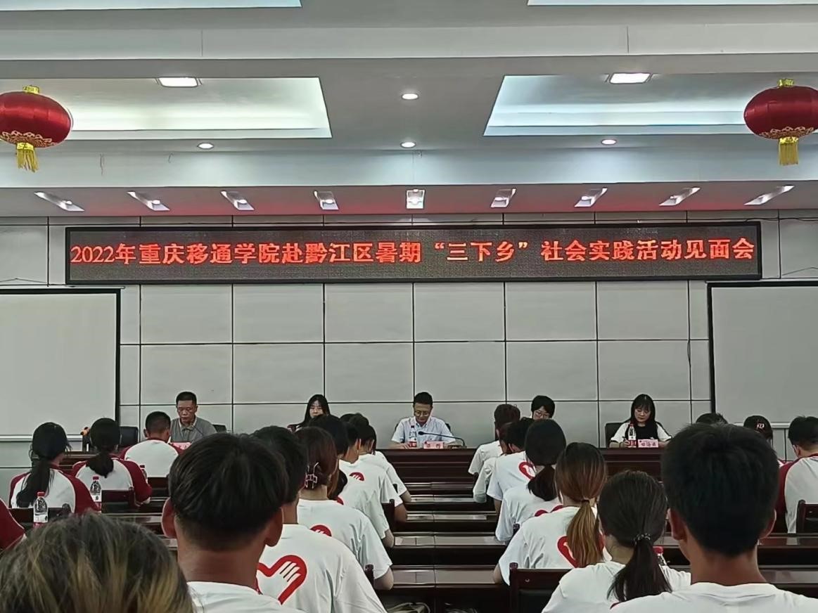 7月6日下午14:00,重庆移通学院三下乡队伍和黔江区团区委在黔江区委老干部局召开2022年重庆移通学院赴黔江区暑期“三下乡”社会实践活动见面会。会议开始首先由校团委龙凤老师介绍学院基本情况,三支队伍的老师和负责人分别介绍了本队的“三下乡”的活动情况,最后黔江团区委副书记梁图同志为大家介绍黔江区区情,并从“受教育、长才干、做贡献”三个方面强调本次三下乡社会实践工作:一,了解国情、社情、民情,在实践过程中不忘学习乡村振兴工作的内在本质与外在要求,深入学习领会社会文化;二,做到有效提升自我能力,完善工作思维,完成力所能及的事,建立良好交流;三,了解国情、社情、民情,需要我们有较强的团队精神与意识,志愿服务精神,乐于帮助当地老人儿童。会议最后梁书记及蔡部长对此次三支队伍在黔江进行社会实践活动寄予厚望,祝愿此次三下乡圆满成功。