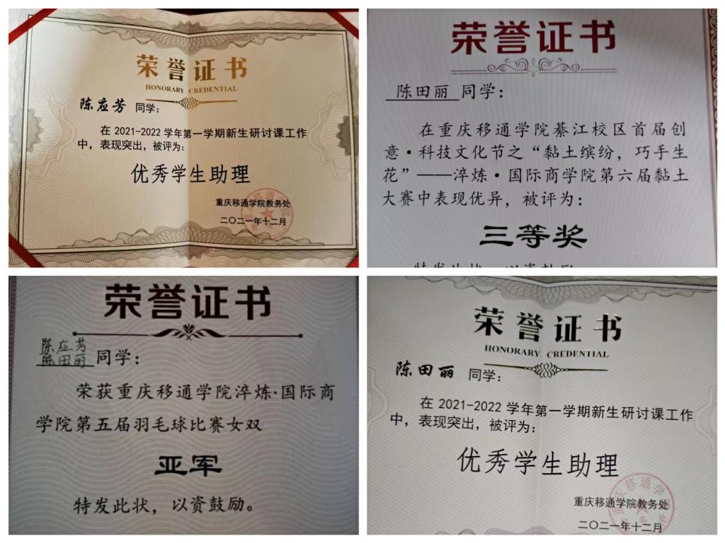 在学校四位一体双院制育人模式下,寝室成员在刚入学的时候,都纷纷加入了各种学生组织,例如:丁依蕊成为綦河书院资源拓展部负责人,陈应芳成为“SHE”关爱女性志愿服务专项支队负责人,陈田丽成为淬炼·国际商学院体育协会负责人等。无论是在院级学生组织还是校级学生团队,每个人都找到了自己的志趣所在,并在其中闪闪发光。在空闲时间,大家积极参加各种感兴趣的完满活动,悠学派总分都近400,在全院排名靠前。陈应芳与陈田丽两位同学共同获淬炼·国际商学院第五届羽毛球比赛女双亚军,向川获得“持”聘舞台·“话”出綦迹主持人大赛优秀奖,寝室团体曾获得团体“粘黏土缤纷,巧手生花”大赛三等奖,寝室文化创意设计大赛优秀寝室奖,月度安全寝室称号等。N514的成员们就像一颗颗星星,在青春的舞台上绽放着属于自己的光芒。