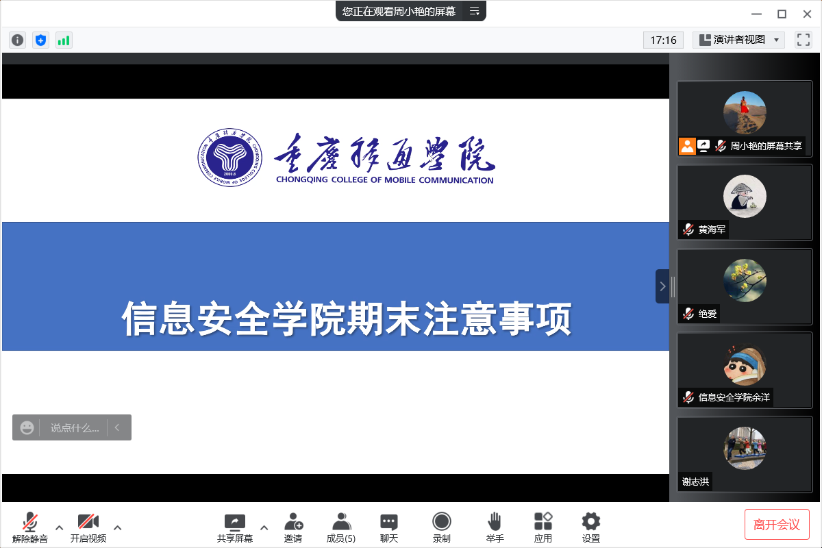 为加强学院学风考风建设,严肃考风考纪,扎实落实期末考试监考、阅卷、资料归档等各项工作, 6月13日晚上8点,信息安全学院于腾讯会议召开期末考试专题会议。此次会议由周小艳老师主持,信息安全学院全体教师参加。