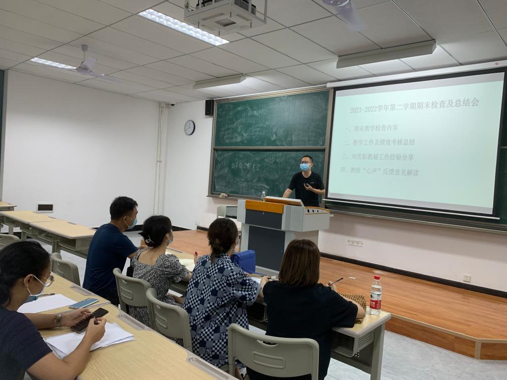 会议首先由范院长介绍了2021-2022学年第二学期期末教学检查的内容并对各检查事项进行了详尽的点评,包括授课计划完成情况、理论教学开展情况、下学期教材征订情况、期末注意事项等教学工作,使全体教师更加了解自己的优势和不足,明确了今后的努力方向。随后,范院长还对本学期的教学工作及绩效考核进行了全面总结,不仅从专业宣传、课程建设、学科融合、实战项目融合等方面介绍了本学期的完成情况,还对师资队伍建设、管理体制优化等方面进行了点评,在总结取得成绩的同时也指出了当前工作中存在的问题和需要不断努力强化的方面,号召全体老师凝心聚力,为学校新商科建设贡献自己的一份力量。