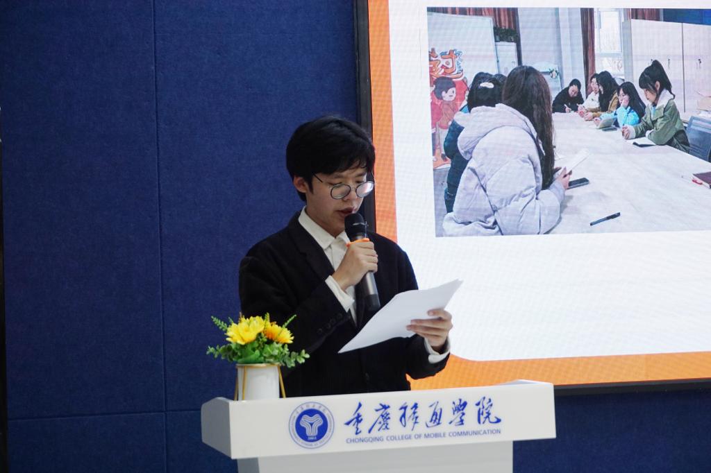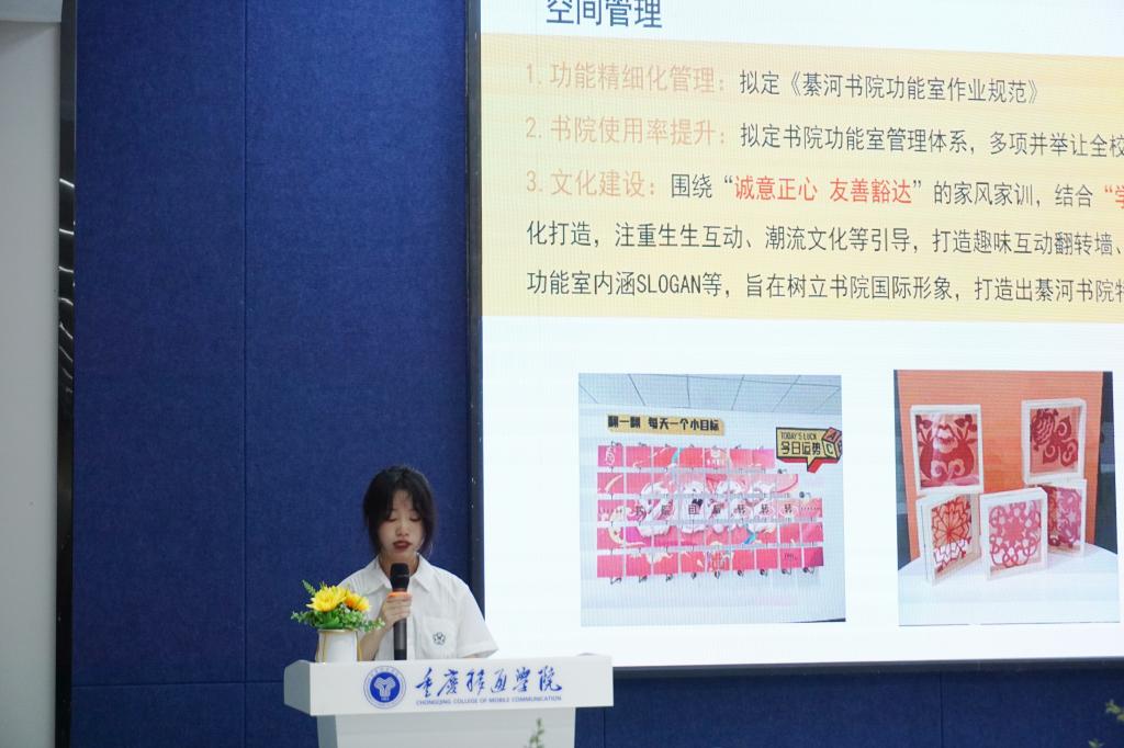 大会上,綦河书院五个部门的负责人依次述职,对自己所属部门的工作进行了总结分享。办公室蒋汶壕讲到从进入部门开始有做不完的表格和资料整理,有时甚至会熬夜通宵,但他说“痛并快乐着,挑战永远不会让他们退后”;资源拓展部郭璟铠分享了工作迷茫时与老师的谈心;文化推广部董晨晨向大家重点介绍了部门里的“技术大佬”带领大家技术培训;活动实践部李怡辰分享了他们筹办活动时的各种困难和工作趣事;综合发展部马冰怡讲到与部门小伙伴之间的成长经历和感动。他们的讲话都给在场所有同学很深的感触,引起大家的共鸣。