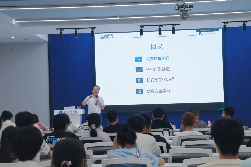 首先,王宁副院长致欢迎词并介绍李鹏总监的履历,然后由李鹏总监作主题内容分享,李总结合自身丰富的企业经验,从长安汽车的发展历史、研发制造、数字化转型、信息安全实践等方面进行了详细介绍。李总谈到:“在数字经济时代背景下,企业数字化转型是大势所趋,制造业也在向科技型企业转型发展。其中信息安全对于企业来说,已经是企业核心业务发展中不容忽视的一部分。”李总从日常工作生活中所遭遇的信息泄漏事件和信息安全隐患为切入点,通过引入国内外热点信息安全事件,对其进行细致讲解,剖析其中涉及的信息安全保护要点,以及后续处理、预防的方法作介绍说明,并对企业整体生产发展的各节点涉及信息安全运营内容作分析,为与会老师和同学们带来了一场专业内容通俗化的信息安全意识建设及知识普及讲座。”