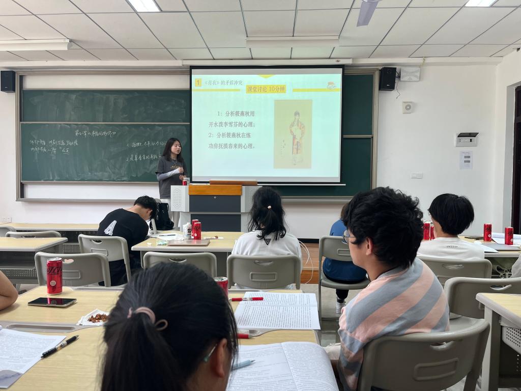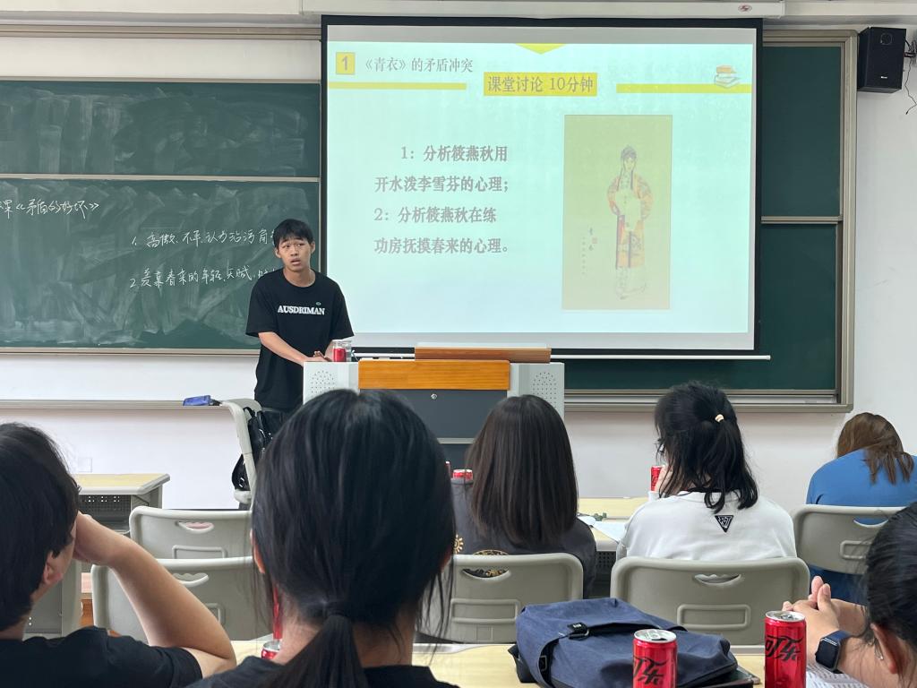 首先,苏老师带我们回顾了上堂课《矛盾冲突》,我们愈发理解——矛盾的深刻性,往往决定故事的深刻性。接下来就开始进入正题《<青衣>的矛盾冲突》,由于苏瓷瓷老师早已安排我们阅读过此篇文章,还为我们安利了当代男作家写女性最好的两位:苏童和毕飞宇。因此我们直接以讨论问题展开——“毕飞宇的《青衣》中,外部矛盾和内部矛盾分别有那些?”八分钟的讨论后,对于外部矛盾的问题,同学们踊跃发言,有说戏剧没落的,有说岁月无情的。可面对内部矛盾的问题时,却集体哑火,我们知道主角有心魔,但解释不清楚她的心魔是什么。苏老师见此情况,引用作家王朔的小说《过把瘾就死》里的内部矛盾对我们进行引导。在这过程中,苏老师提了一个新问题——推动《青衣》的故事情节发展的主要是内部矛盾还是外部矛盾,由此出现了本堂课的第一次分歧。有的同学赞成外部矛盾,有的同学赞成内部矛盾。苏老师见我们还是没有完全理解其中的意思,便再此问道:“你们认为心魔的作用是什么?”我们答:“塑造人物,也是人物的行动力之一。”“那么你们是否真正的了解主角,我们从下面两个问题分析讨论:1.筱燕秋用开水泼李雪芬的心理;2筱燕秋在练功房抚摸春来的心理。”苏老师说道。
