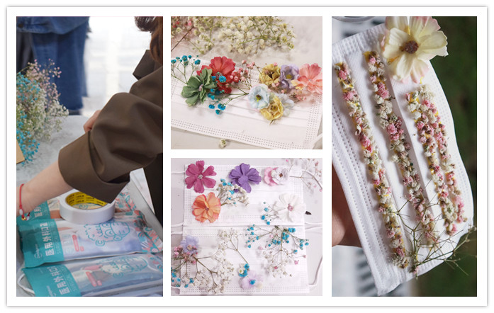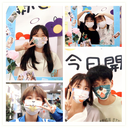 同学们先是在体验点自己动手用花朵装饰口罩,再戴上口罩拍摄一组2018年和2022年的微笑对比图,以此纪念2018的青春,勉励2022的自己。