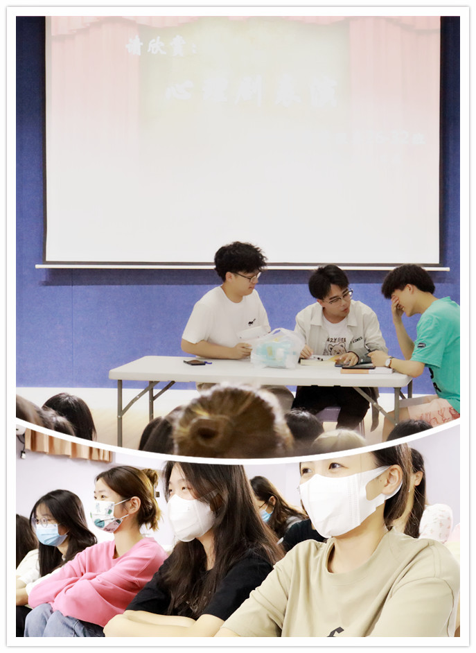 在蔡老师的倾情演讲后,同学们贡献了一场精彩的心理剧表演。该剧以疫情下的校园为主题,描绘了同学们在疫情期间从浑浑噩噩、找不到目标和期望到通过自身的努力,找回自己的初心和目标,向着前进的方向重新起航的故事。结束了心理座谈会,同学们与蔡老师一同前往各个心理活动体验点。