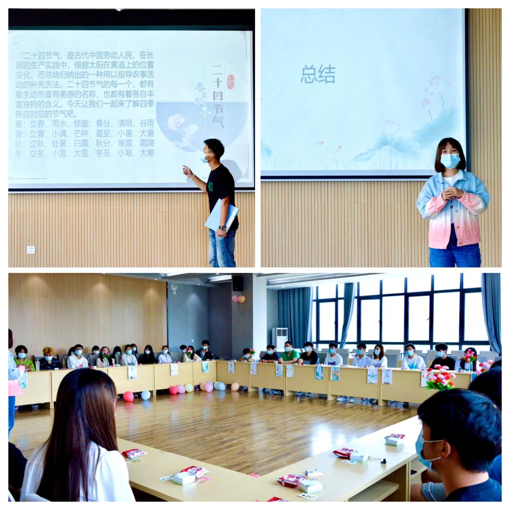 春深四月去,夏来五月新。为增强同学们关于二十四节气的认识了解,提高对中国传统文化的保护意识,2022年5月11日、5月15日、5月20日淬炼·国际商学院2021级工商管理类1-7班依托二十四节气开展“奇妙夏日·传统时节知多少”主题年级会,辅导员尹金维老师与同学们在传统习俗中体验二十四节气的乐趣,为他们今年的初夏增添了几分色彩。