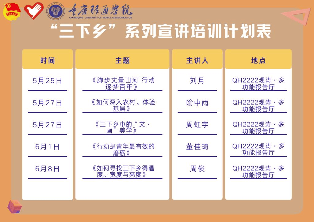 为锻炼大学生意志与能力,开拓其视野、完善其知识、提高其才干,鼓励青年在实践中成长、在实践中提高、在实践中奉献社会,培养青年大学生艰苦奋斗的精神和社会实践技能,致力打造大学生“三下乡”专业团队。校团委特构建暑期三下乡宣讲团,组织展开“三下乡”系列宣讲培训(共5期),使学生深入了解三下乡社会实践活动内容及要求,掌握三下乡理论知识,感悟三下乡实践活动的真谛。于5月25日起,校团委于綦河书院QH2222观涛·多功能报告厅相继开展“三下乡”系列宣讲培训。培训以线下+线上的模式进行,为全校师生提供了进一步了解“三下乡”的平台,增强大学生对“三下乡”实践活动的信心。
