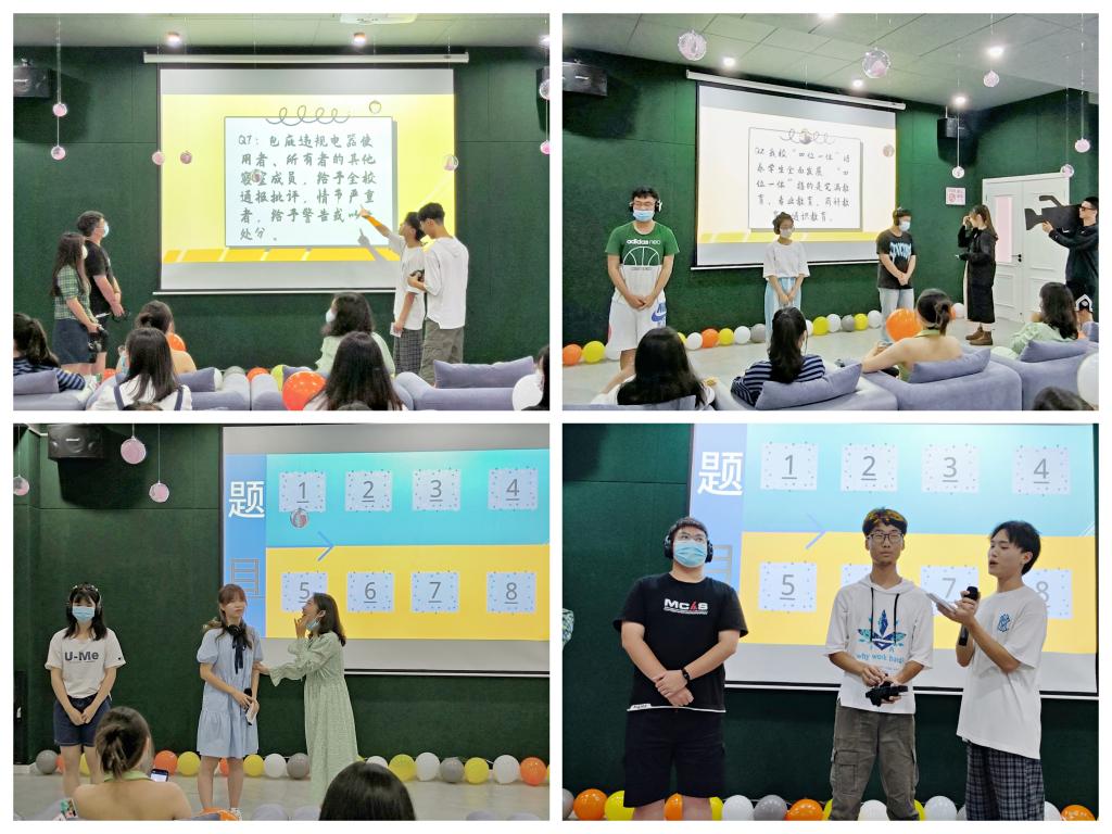 《重庆移通学院学生手册》是每一名移通学子的必读之物,为了帮助同学们更好的理解手册中的内容,激发同学们研读手册的积极性,特此设计《最强大脑》环节,开展以“学生手册”内容为主题的“传话接龙”游戏,在规定的时间内背诵一则手册中的条例进行速度与激情的追逐对抗赛,得分最低的参赛队伍应由主持人喝柠檬水作为惩罚,奖惩兼备的游戏规则瞬间吸引了在场同学们的注意力,现场气氛一度达到燃点,充分激发出同学们的参与度与活跃度。