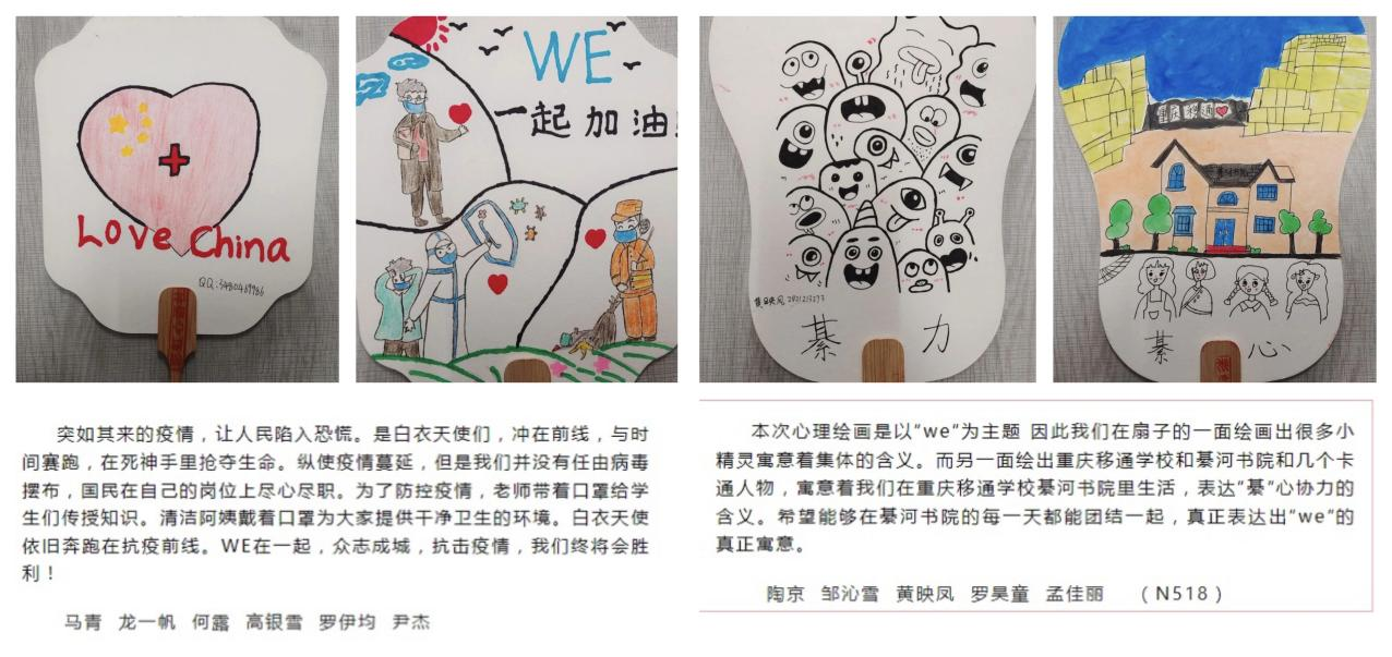心理绘画是非语言形式表达个体情感的重要方式,本次绘画大赛以表达性艺术疗法为指导,通过心理绘画活跃校园心理艺术气氛,增加文化活力;以“WE”为主题,主题中文意为“我们”,发音同“喂”,打招呼的意思,旨在让我校师生与他人协同合作,产生思想碰撞,以色彩表达情感,以笔触搭建友谊,在创作中展现个人魅力,培养团队精神。大赛创新作品呈现形式,以扇作画,给予师生美的感受的同时增强实用性,将艺术与生活实际相结合,正如艺术疗愈中提到艺术作品的创作、欣赏和使用过程本身就具有一定的疗愈作用。