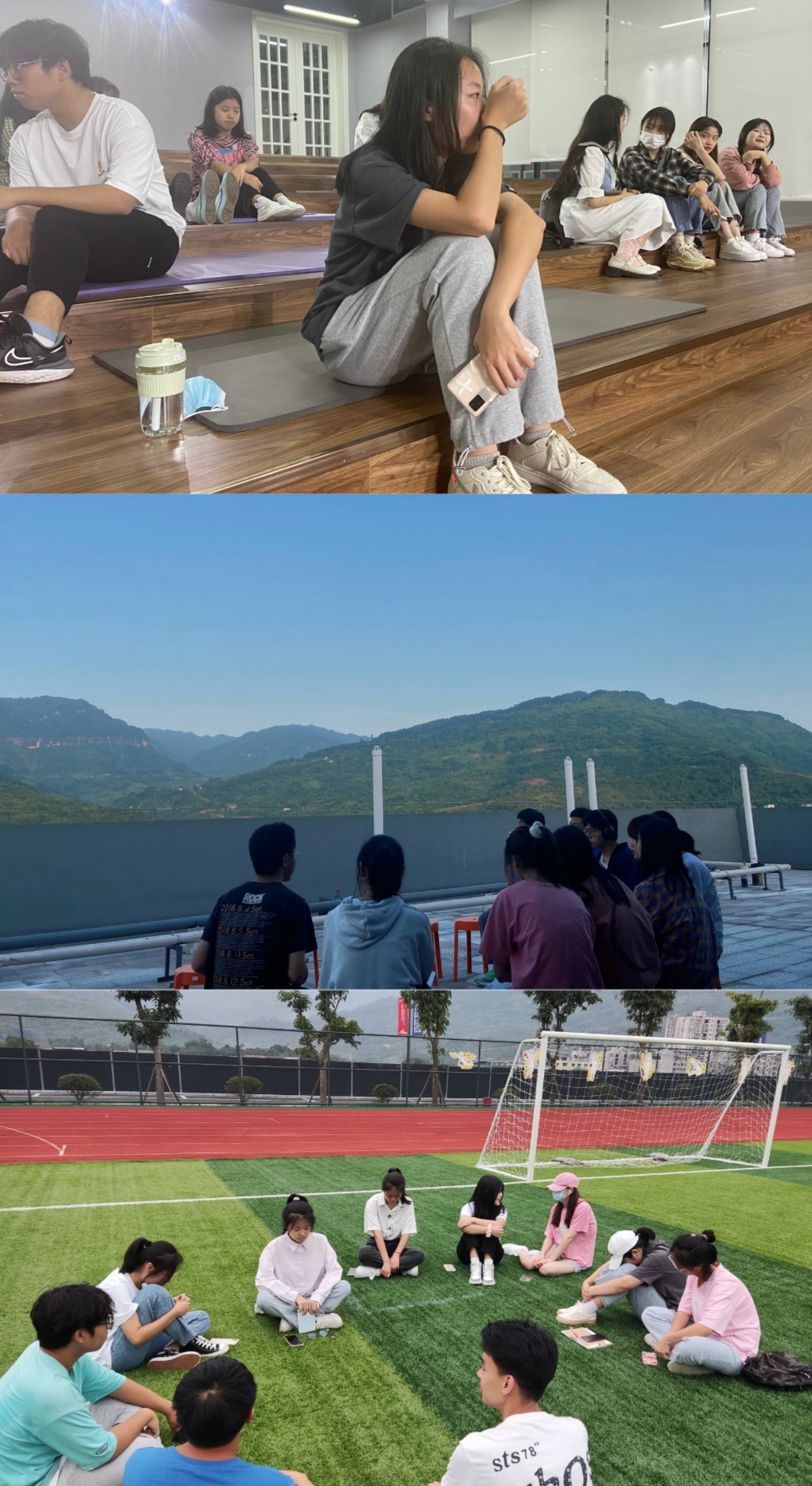“重启大脑·发呆角”田俊楠同学分享到,我们前后一共举办了三次发呆角活动,同学的积极性都很高,活动一经发出瞬间被报满,甚至有的同学每次都有参与。第一次活动,由于天气原因,我们只能在阶梯教室举行,活动现场鸦雀无声,第二次活动,天公作美,我们如期在天台举办了活动,看着远处的群山,夕阳的余晖洒落在身上,半小时的沉思后,同学们分享了生命中最感动,第三次活动,我们的问题是童年,举办的地点在操场,同学们将自己的童年趣事一一道来。
