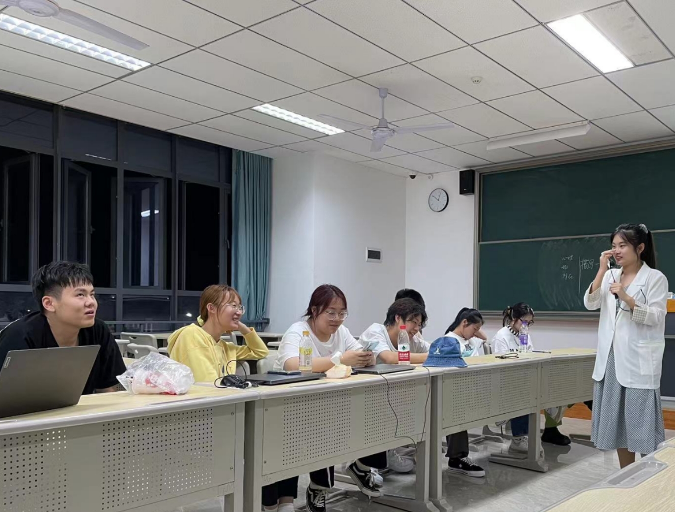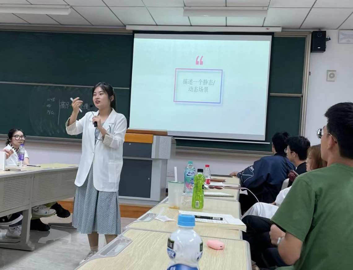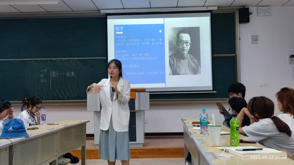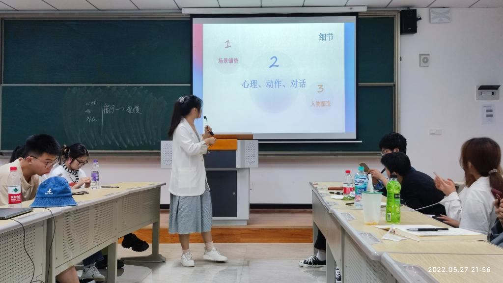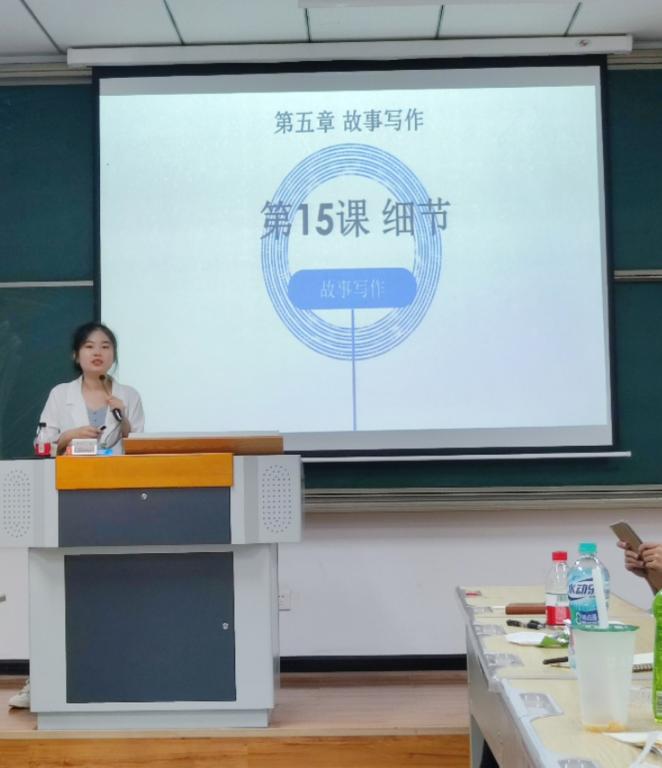 5月27号晚上,李慧文老师一进仁者楼309教室,同学们都“哇”的一声,原来慧文老师穿着淡蓝色裙子白色衬衫,就像邻家大姐姐一样。随着一片夸赞声后,慧文老师就揭开了今天《故事写作》课的篇章——“今天讲故事写作中的表现手段及细节,由其是细节!”