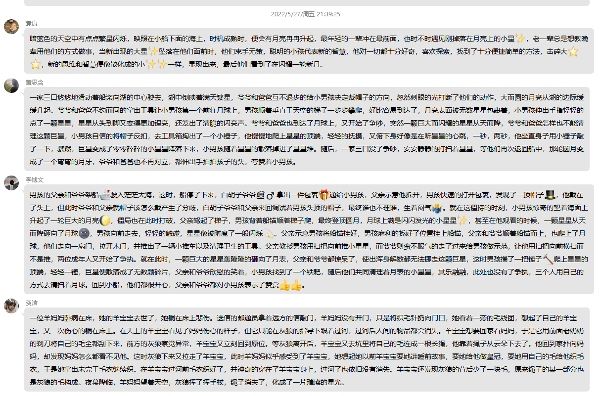 同学们将写出的作品发布到非虚构群里,描写的一派需要用生动形象的语言对动画进行描述,并推动着故事的发展,整个故事看上去仿佛身临其境一般,即环境具体化。叙事的一派则用精简的语言叙述发生的一连串故事,将整个事件按次序串联起来。慧文老师看到大家的作品,逐个点评,首先看到张莉、李博文同学描述中还加入了“emoji”表情符号,不禁笑了,她说这也挺生动形象的。点评袁康同学时,慧文老师指出,袁康同学是在用自己的价值观去给故事作评价而非对故事展开描绘,并不符合描写的要求,需要减少一些议论和评述。