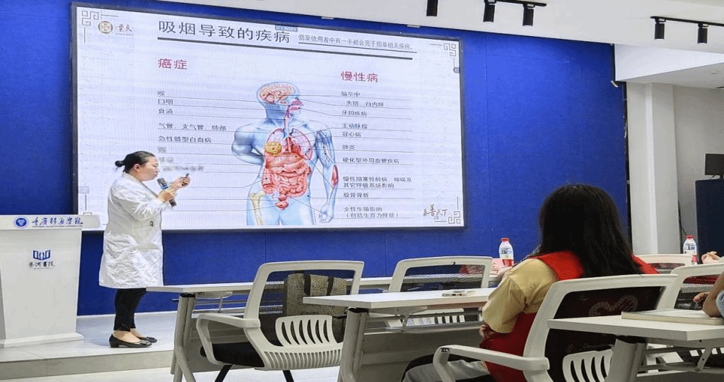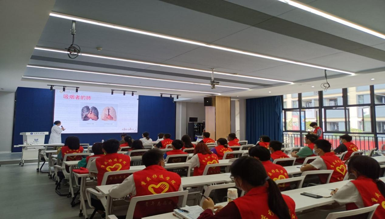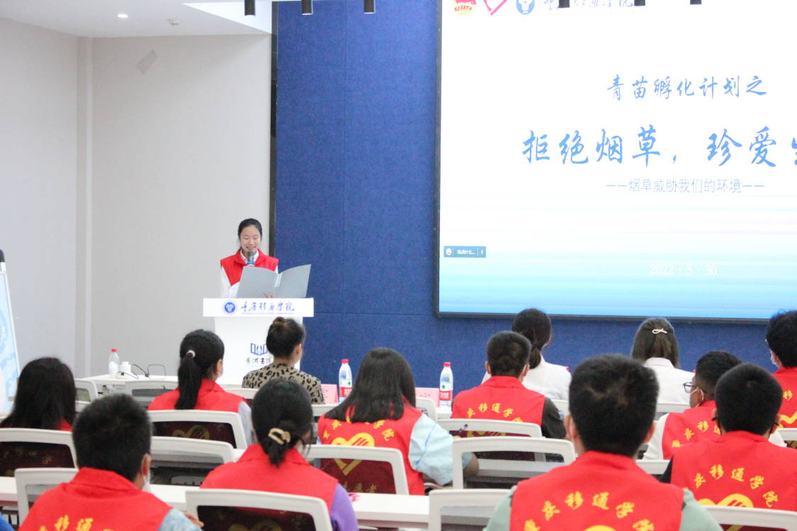 健康,随烟而逝;病痛,伴烟而生。吸烟“百害而无一利”,影响健康,缩短寿命。据统计:目前我国有3.5亿烟民,占全球吸烟总人口的三分之一,且近1亿年轻人因吸烟过早死亡。为普及有关烟草危害知识,提高同学们远离烟草的意识,我校红十字应急救援志愿服务专项支队携手青年志愿者协会邀请綦江区中医院肺科科室主任周明娅主任于2022年5月30日在我校QH2222观涛·多功能报告厅举办了2022世界无烟日:“拒绝烟草,珍爱生命”的知识讲座,对同学们进行相关知识培训。本次培训采取“线上+线下”的方式进行。