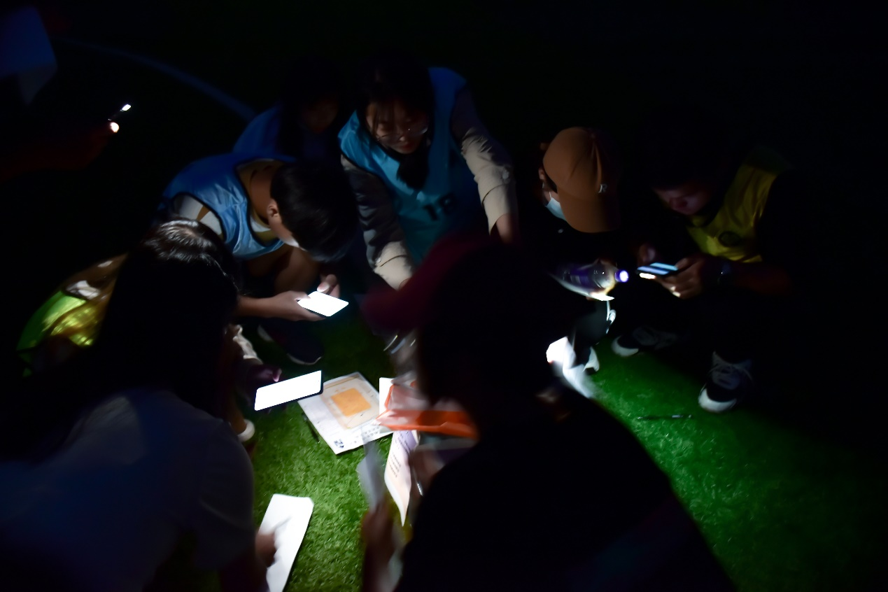 夜幕降临,随着裁判一声令下,操场上的探照灯关闭,操场内陷入黑暗,同时充当障碍物的帐篷里泛着柔光的相继被点亮,星星点点分布在操场上,散发着神秘的气氛。随着活动的开始,参与小组分批次出发,操场上充满了紧张刺激的氛围。