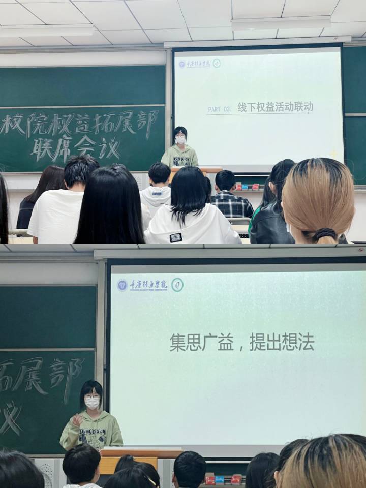 此次权益拓展部联席会议的顺利召开,是推动我校学生会权益拓展部校院两级联动的积极行动,既对上一阶段学生会权益拓展部工作进行了总结反思,也对后续工作作出规划,有效加强了校学生会权益拓展部与各二级学院权益拓展部的交流。在工作交流中,校院两级权益拓展部互学互鉴,增进了部门间的了解程度,使大家更加明确了权益拓展部的定位,并在一定程度上加强了部门对于校园权益知识的宣传推广、权益活动的组织开展的能力。校学生会权益拓展部与各二级学院权益拓展部,将会齐心协力,共同去扮演好“为同学服务者”的角色,积极解决同学们在校园中所遇到的权益问题,为同学发声。