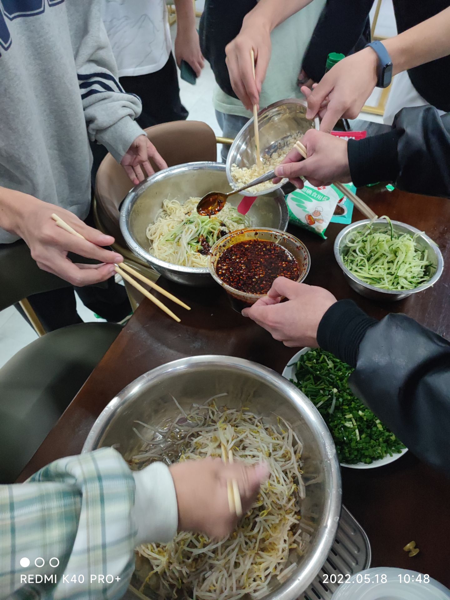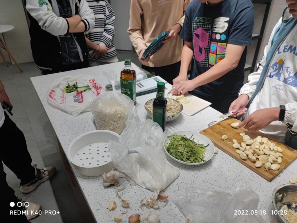 活动现场,参加的同学都在紧锣密鼓准备相应的食材,咚咚的切菜声,齐刷刷的洗菜声,当然还有拍大蒜和黄瓜的声音......不仅如此,说话声、笑声和欢呼声连成一片,处处洋溢着欢乐的气氛,让大家在紧张繁忙的学习生活中度过一段轻松、愉快的周三。