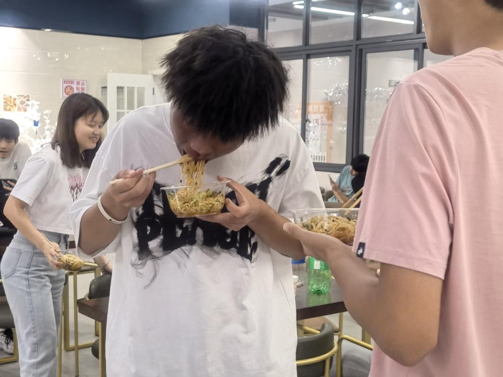 晓蝶老师分配完工作之后,本次活动立刻进入了紧张有序的状态,每个小组分工合作,切菜,摆盘,洗豆芽......每个人都开始着手自己的工作,一盘盘配料和面条在同学们的手中传递,通过相互合作,不一会美味诱人的凉面就摆放在桌子上了,每个人做的面条都有自己独特的名字,并且蕴含了特殊的含义,比如,漠漠水田飞白鹭,蒸蒸日上......在我们开启品尝成果的时候,同学们争着、跑着、喊着、吃着、评着、乐着,活动在欢声笑语中进入了高潮,赵文杰同学甚至还做了炒面、小面,不止于凉面这一主题的束缚。