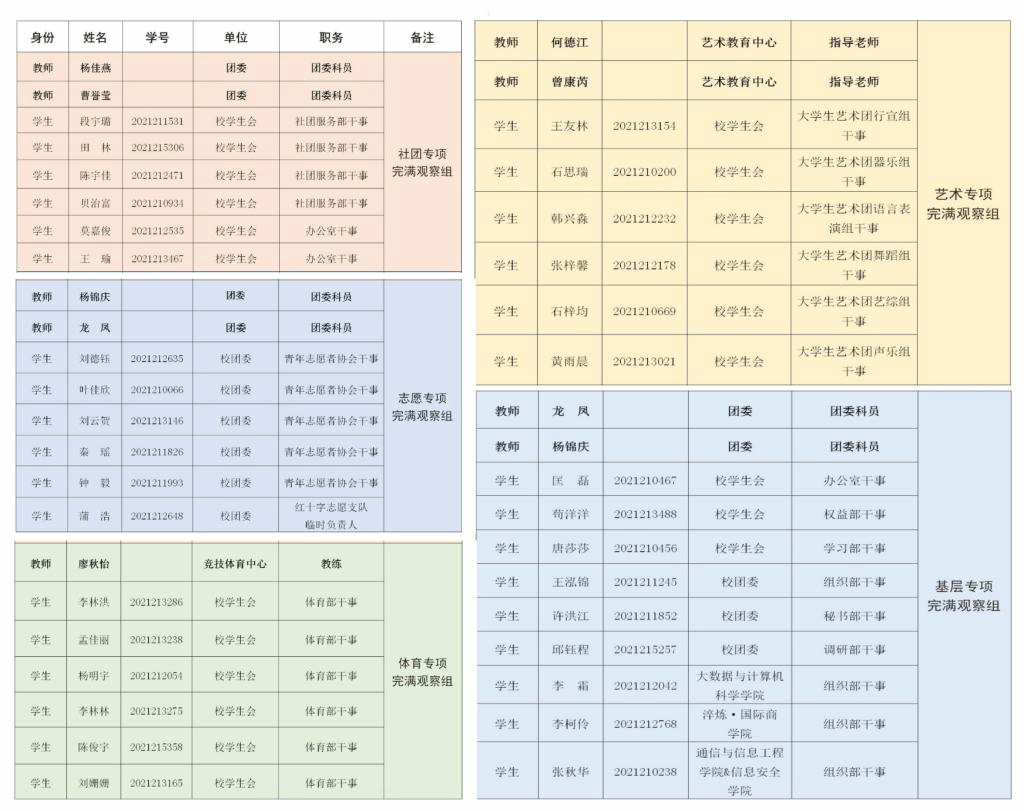 本学年綦江校区共招募校级完满观察团成员40名,根据完满教育活动举办性质,分成五支校级完满观察组,分别是社团专项完满观察组志愿专项完满观察组、艺术专项完满观察组、体育专项完满观察组以及基层专项完满观察组为,使小满工作更加专业化、精准化的进行。