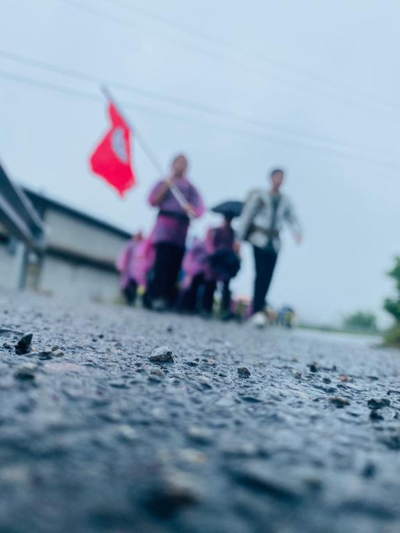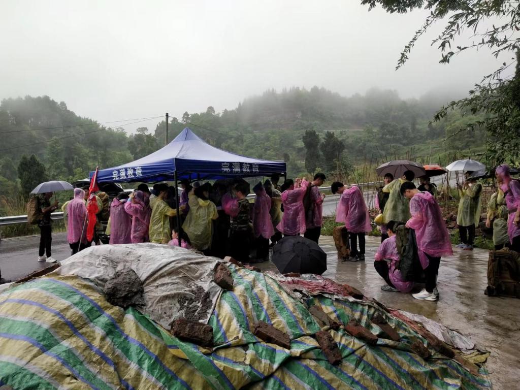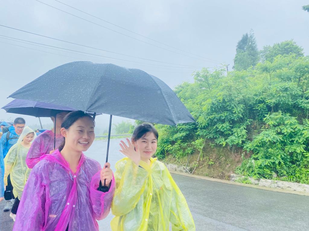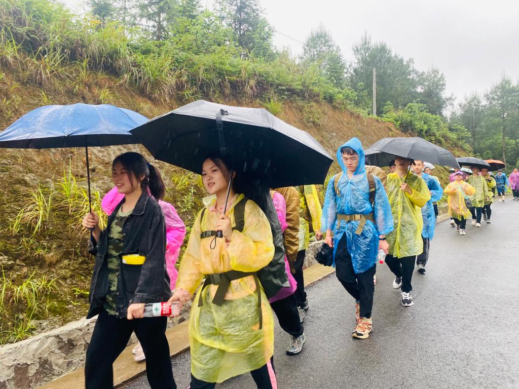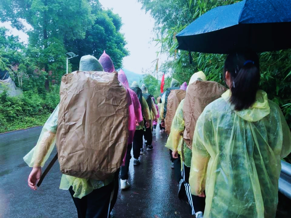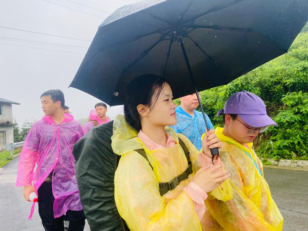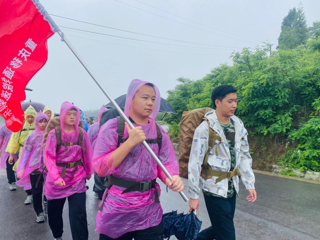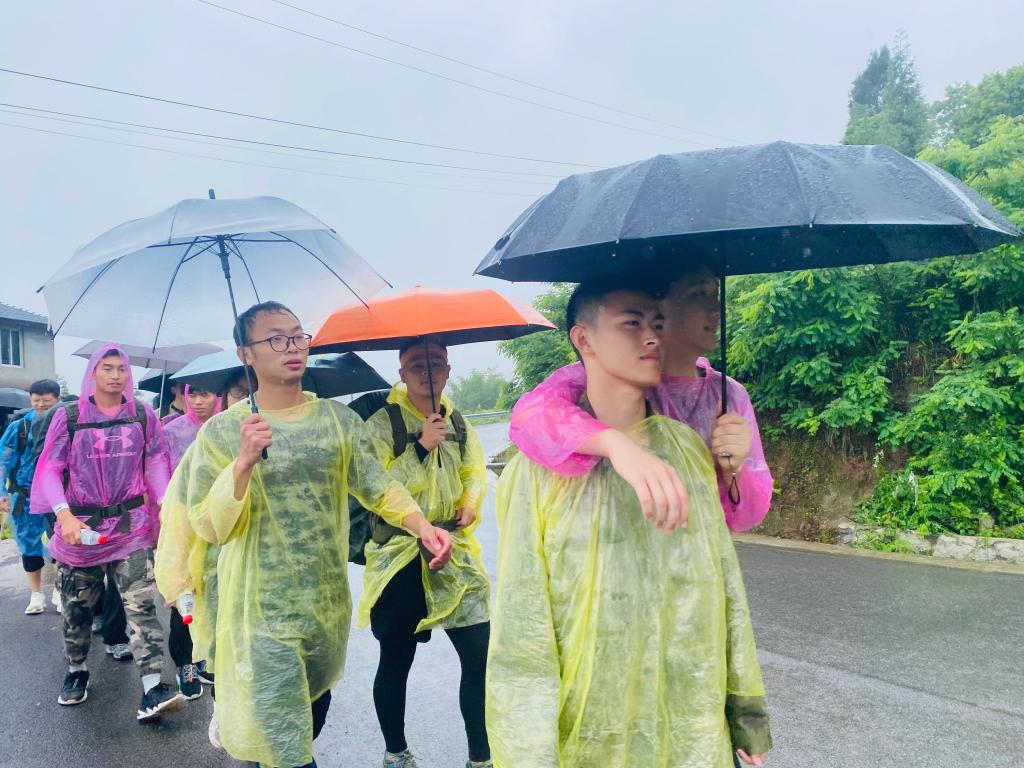 顶着温柔的雨,行走在水泥路上,队伍分为两路纵队,整齐有秩序的前行,张桃教练一路在旁随行。飘扬的队旗、整齐的队列行进在路上,成为一道亮丽的风景线。这是一场体力与意志的考验,细雨中飘扬的旗帜是一种信念。路上,若有前方来车,张桃教练则会强调前方来车,统一靠右行驶等细节来保护大家的安全,还会建议在行驶过程中,怎样走路的方式最为轻松省力,让同学们节省更多体力。由于路途很长,部分女同学到后半路程走的有些吃力,她们依然不放弃,紧随队伍,用坚强的意志自己磨练。