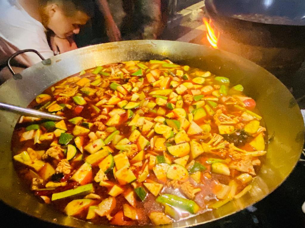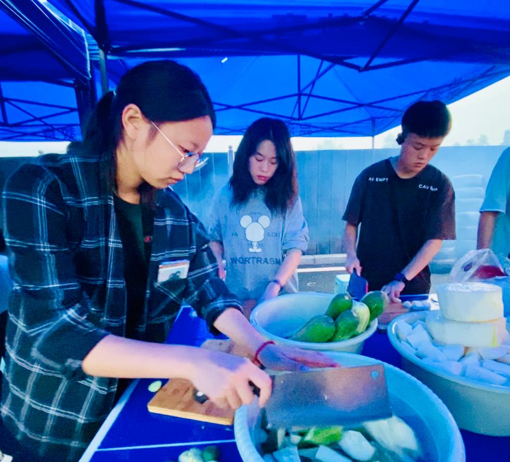 晚上同学们在历经人均40000+步数、来回26余公里、徒步八小时后,在操场营地训练旁开始烧柴火大锅饭。搬帐篷、烧火、洗碗、洗菜、切菜、起锅烧油、出锅。同学们精心制作着这一份来之不易的晚餐。享受晚餐之余,大家聚坐在大锅旁叽叽喳喳讨论着这平凡的一天,却又不平凡的自己。“我没想过自己能坚持下来”、“好几次上坡我都想放弃,胸口闷,头晕”、“他的头发都被淋成面条了”……