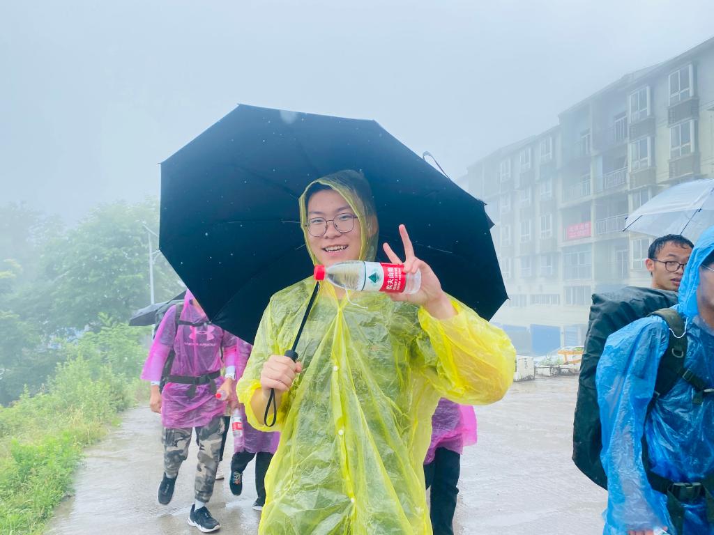 路上一共设置三个补给点,分别在5公里、9公里、13公里。黄杜娟教练和后勤人员提前在补给点搭好帐篷,为大家准备好瓶装水、纸巾、雨衣及急救箱,静候大部队的到来。即使在最冷、雨最大的时候,也要有最热的血。要知道万里长征的第一步是爬坡,数不清跨过了多少个陡坡,只知道每走一步都能听到自己气喘吁吁的声音。虽然天公不作美,雨越下越大,额头分不清是汗水还是雨水,风只知道往脸上刮。但是绵绵的细雨增添了别样的色彩,在大道沿途郁郁葱葱的树木与前行的队伍相映成趣,给予同学们回归自然的享受。徒步锻炼我们的意志,培养我们的信心,让每个人重新认识自己身体的潜能。这一路走来既有扶持,也有鼓励,经受了磨练、锻炼了身体,放松了心情,呼吸了新鲜空气,也增添了同学之间的友谊,展现了属于“移通人”的精神风貌。从每一个同学身穿湿而未干的迷彩服可以看出,内心舞动的是一团永不熄灭的青春火焰,我们与寒风抗争,与潮湿作战,与极限搏斗。不掉队,走!走出万里河山的青春气概;不掉队,走!走出青春无限的正气凌然,因为我们每一个人,都不掉队!