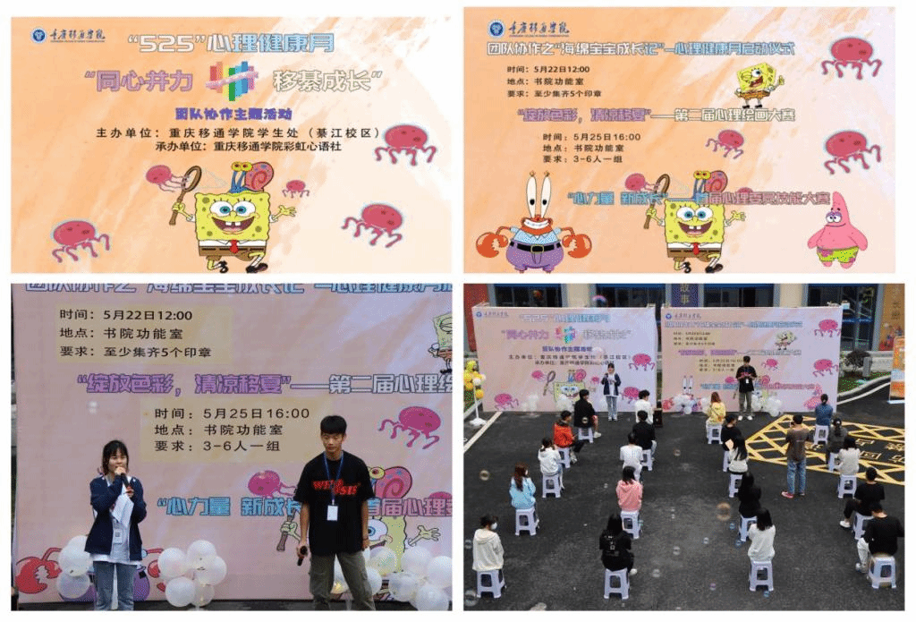 盛夏如期而至,我校5月健康心理月同盛夏一同来临。“同心并力,移綦成长”——“5.25”心理健康月团队协作主题活动如期开展。为培养我校学生“从小我到大我”的大局意识和协作精神,增强向心力和凝聚力,引导学生关注自身心理健康,关爱自己、了解自己、接纳自己,进而关爱他人,关爱社会。2022年5月22日,由重庆移通学院学生处(綦江校区)主办、彩虹心语社承办的团队协作之“海绵宝宝成长记”心理健康月启动仪式在綦河书院2号楼中庭震撼开幕。