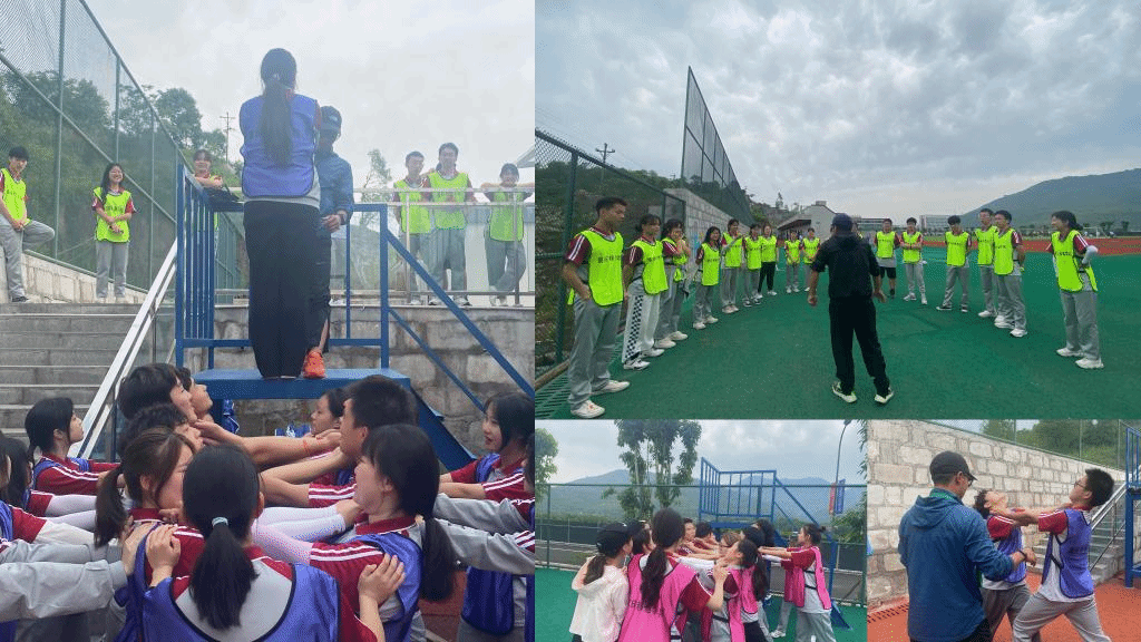 17日上午,微微有些许阳光洒下,落在青春洋溢的同学脸上,教练带领各队伍共18名队员,于田径场展开营地训练。此次训练项目为背摔,这个活动极其考验团队信任能力、相互之间的合作。背摔的高台为高达1.5m,在无任何其他保护措施的情况下,同学们从高台下自由向后倒,其余同学在下面把手相互交错,形成5到6层保护层,全力保护每一个队员。在从高台落下之前,队员之间相互鼓励,在落下的一瞬间,那种恐惧感也已经慢慢消散,因为足够信任、足够团结,这个项目完美完成。