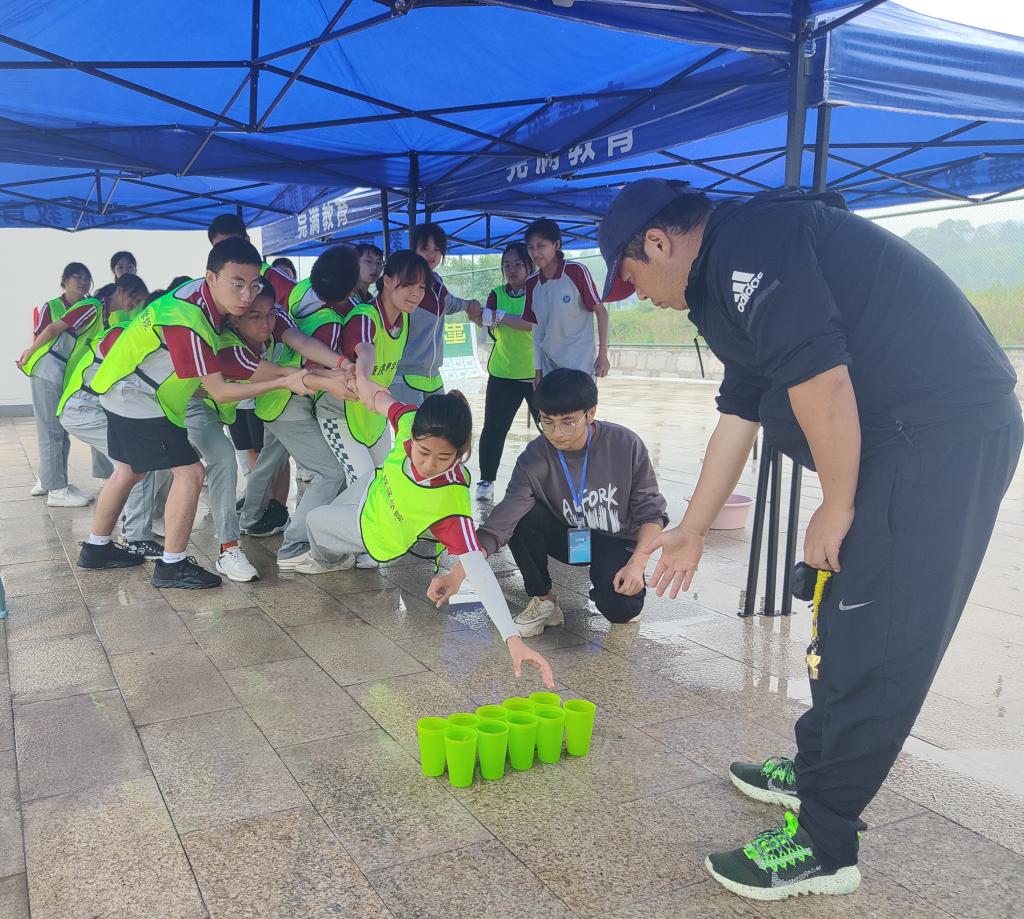 下一个项目的名字叫“群龙取水”,大家需要站在起始线内,在身体任何部位都不触碰地面的情况下合作取出线外的水杯,项目正式开始前,同学们都在积极的出谋划策,表现出高度的团队合作意识;项目正式开始后,同学们同力协契手拉着手共同保护着取水杯的同学,最后完美的完成项目,展现出高度的团队配合能力。此项目不仅锻炼了同学们团结力,更锻炼了同学们的行动力和沟通能力。通过这个项目,同学们更加深刻的明白了团队合作的重要性,也变得更加默契。