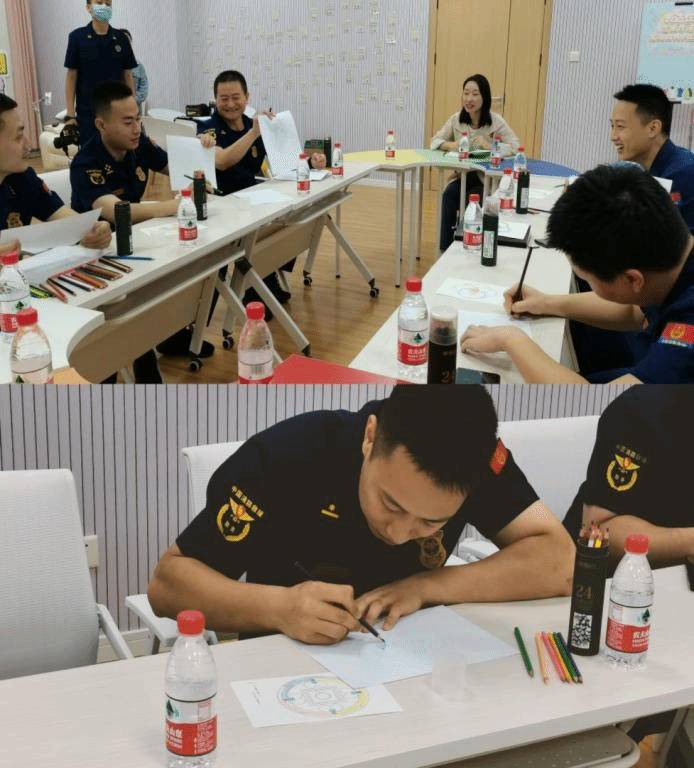 绘画心理分析技能学习在团体心理辅导室进行,包括曼陀罗静心和爬山图舒心三个内容。在林老师的讲解中,消防员们伴随着轻音乐,使用彩铅进行曼陀罗填色,用于平缓心绪觉察内心,为后续主题画心理分析做铺垫。“爬山图”心理绘画体验不考验绘画功底,只针对真实情感表达,作为一种解决实际问题心理工作技术,爬山的方式投射个体解决问题的方式,消防员们在白纸上画出以“我”为主人公的爬山图,在与林老师的对答询问中将爬山图内容与实际问题进行有效链接,引导消防人员思考新的爬山方式和实际生活中的资源,将资源进行整合,促进问题解决。