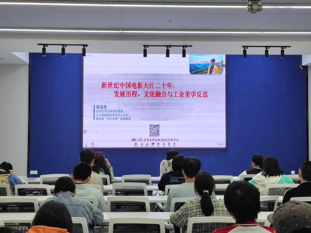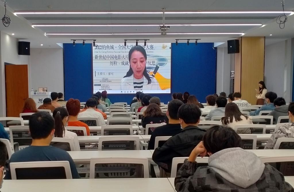 5月18日15:00綦江校区观涛功能能报告厅,举行了2022钓鱼城·全国大学生影评大赛专题讲座,讲座邀请北京大学艺术学院教授、北大影视戏剧研究中心主任、教育部“长江学者”特聘教授、本届影评大赛评审主席陈旭光出席,并以《新世纪中国电影大片二十年:发展历程、文化融合与工业美学反思》为题开展主题讲座。讲座由电影评论中心主任彭可老师主持。