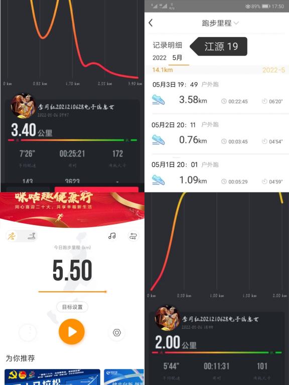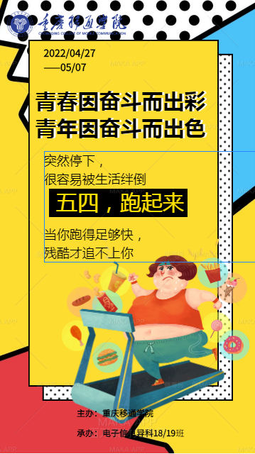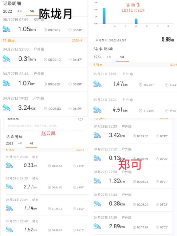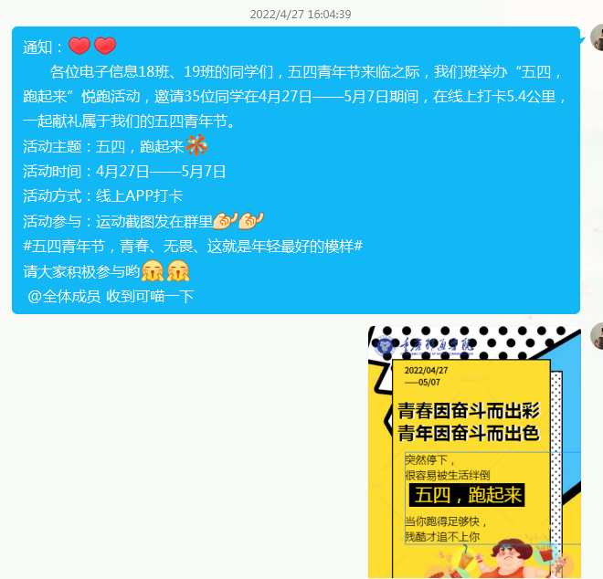为进一步弘扬五四精神,倡导文明新风,彰显时代精神和青春价值。4月27日—5月10日,通信与信息工程学院异科导师黄杜娟老师在线上组织了一场主题为“五四·跑起来”的线上悦跑活动。本次活动由黄杜娟老师发起,主要面向2021级电子信息类18、19班异科班和迷彩俱乐部的同学,共计40余人参加。