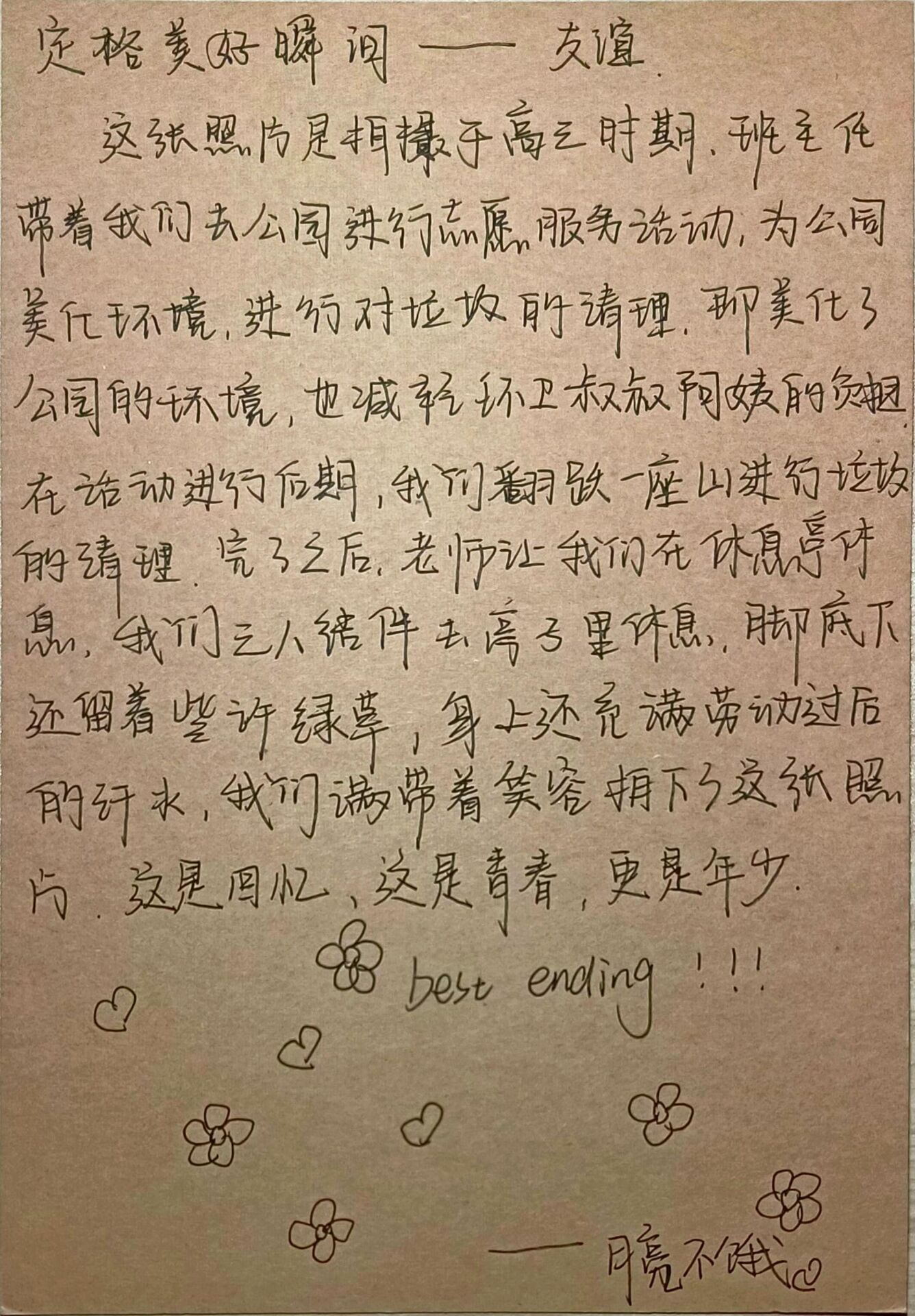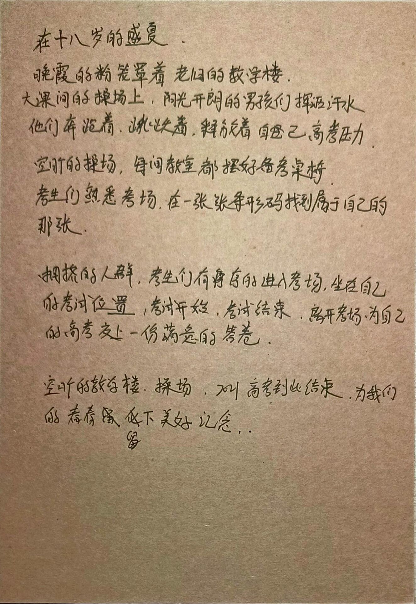 “高中的晚霞也许是每个高三学子的意难平吧。太阳的余光透过层层云朵洒落在房屋上,我们在最好的年纪披着阳光出逃,用一腔孤勇做最无畏的梦,那段奋斗的时光,是我最难忘也最美好的日子啊。”