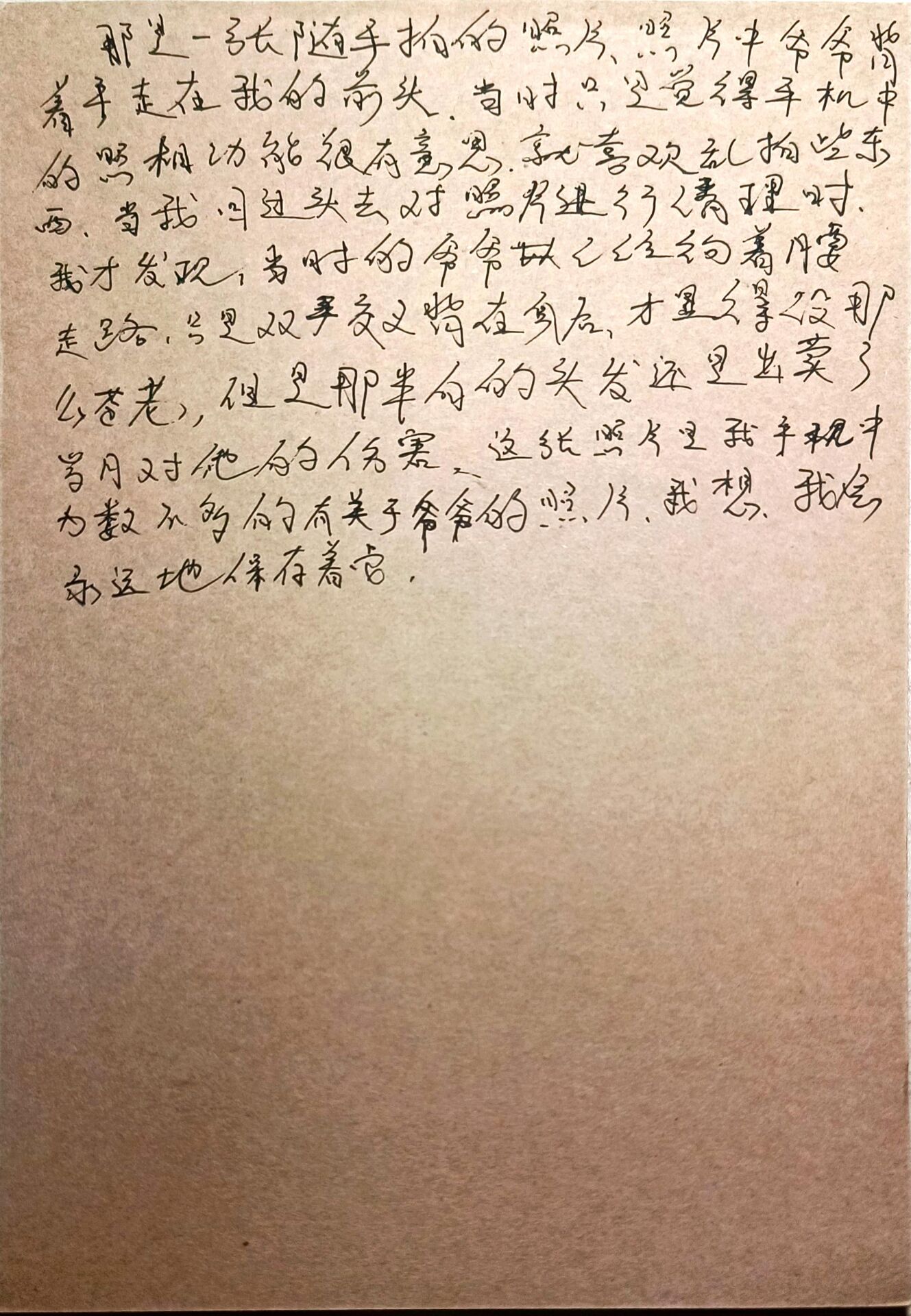 故事情节:我的手机里一直保存着一张随手拍的照片,照片中是爷爷背着手走在前方的画面。当时,我只是因为对新买的手机照相功能感到新奇,便将自己生活中的碎片随手记录下。过了很久,在清理相册时无意中又看到了这张照片,才发现走在自己前方的爷爷早已佝偻着腰,唯有那双依旧背在身后的双手,让爷爷的背影看上去不似那么苍老,但那半白的双鬓却出卖了岁月带给他的痕迹。