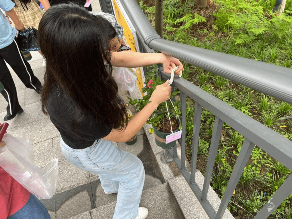 在花卉还未开始“成廊”前,由花卉协会临时负责人们为同学们派发定制好的领养信息板,将它们悬挂在相应的花卉上,并且为大家讲解了该如何养护这些盆栽。在盆栽领取过程中大家需要将花盆用钩子勾起来,一开始同学们都不太会操作,后面经过负责人的讲解和教授后,同学们慢慢的掌握了方法并且能熟练的挂了上去。