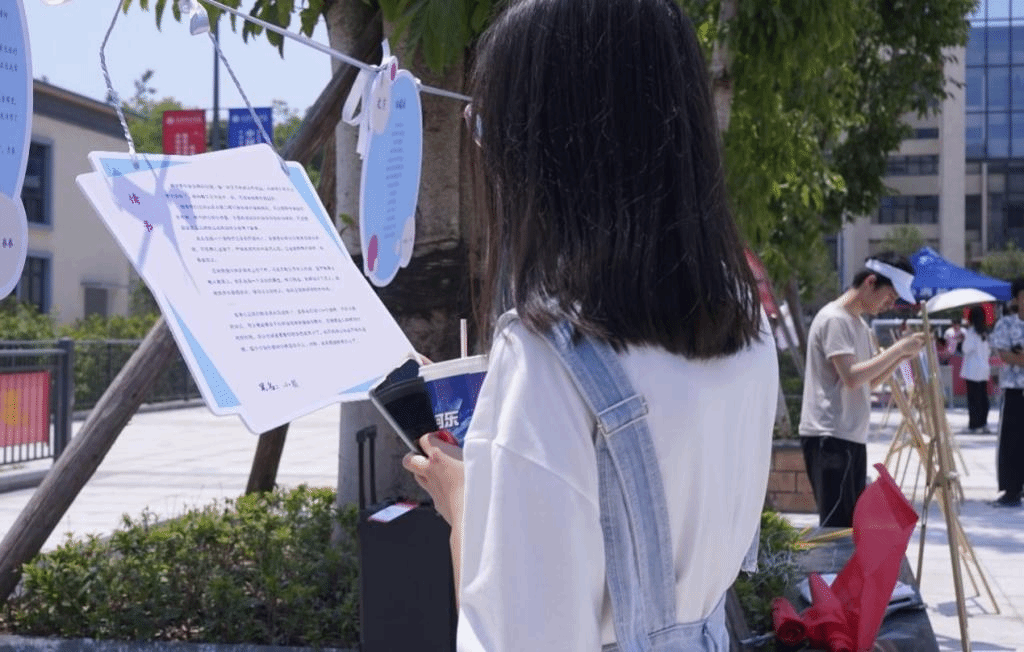 不少情书的作者更是亲自带着室友、朋友来看看精美制作出的情书展板美美的“炫耀”一番,看着自己的作品在室外向众人展示,心中的喜悦溢于言表,他们相互拍照留影,记录这令人难忘的美好校园时光。