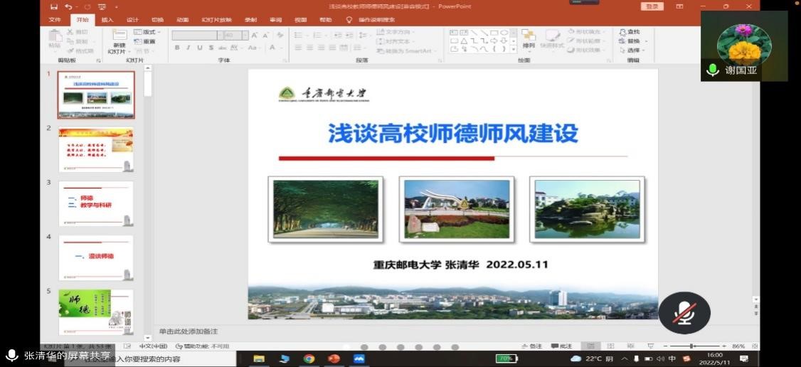 为增强教师队伍的服务意识,树立新时代教师应有的职业道德观,进一步提高教师的职业素养,推进师德师风建设,5月11日,在谢国亚主任的主持下,两校区数学与物理老师们通过腾讯会议进行了一场特别的线上联动。教师们分别齐聚在綦江校区仁者楼312教室与合川校区101会议室,聆听了重庆邮电大学博士生导师张清华教授带来的题为“浅谈师德师风建设”讲座。