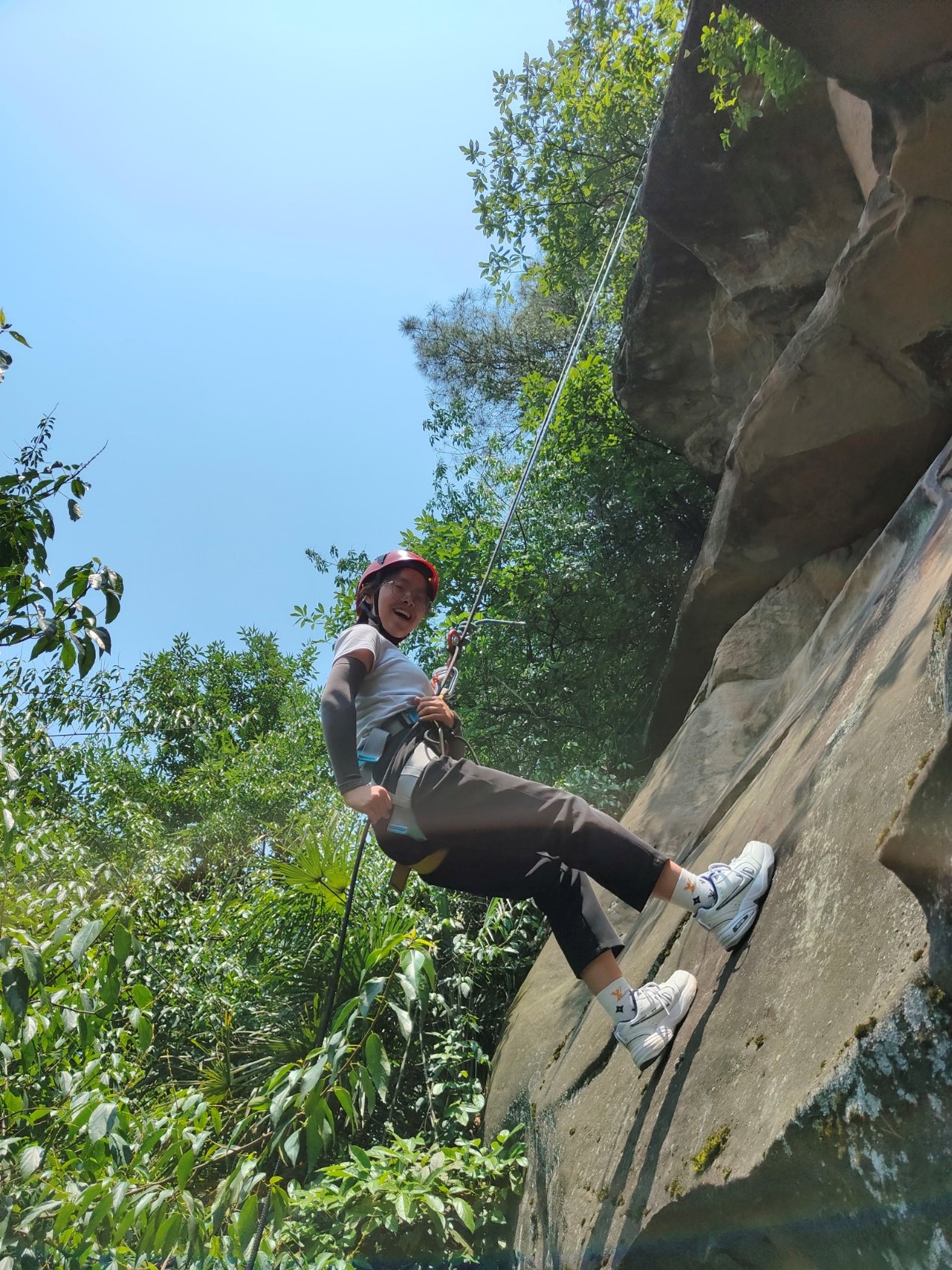 崖壁下降对于一个户外爱好者来说可谓是又爱又恨,看似运用几根绳索就可以从崖壁的上端降落到崖壁下端,这里面却是包含了许多绳索技能等各种攀岩知识。去年中国大陆共发生了五百零九起户外登山事故,死亡人数六十五人,可见登山崖降必须具备在专业人士的指导下进行。正如教练常挂在口中的那句话“不能保证安全,一切都是空谈”。在教练的专业的指导下,户外运动队队员们对前期绳索技术知识进行了温习,随后很多队员在安全的前提下顺利进行了属于自己的第一次户外崖降。