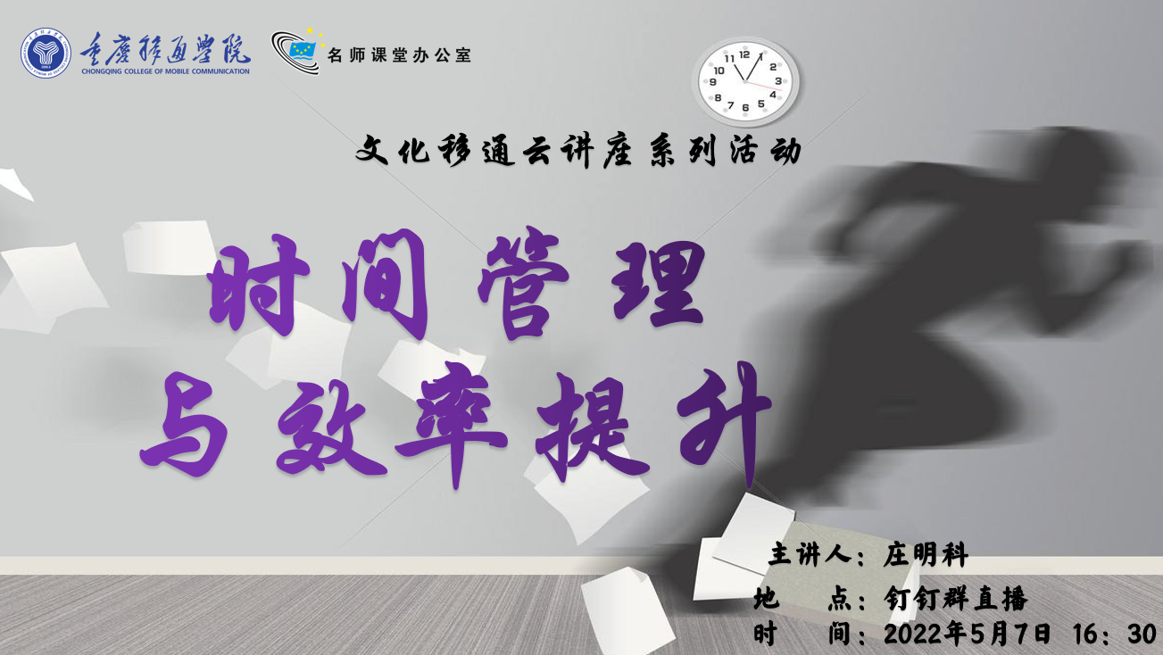 斯宾塞说过“必须记住我们学习的时间是有限的。时间有限,不只由于人生短促,更由于人事纷繁”。有效率的进行时间管理不仅能够提升自身的学习效率,还能推动自身的合理发展。那我们应该如何有效的提升对于时间的管理呢?5月7日下午4点30分,文化移通开展线上研讨会,由庄明科教授为我们带来《时间管理与效率提升》的线上讲座,为同学们讲述时间管理的奥秘。