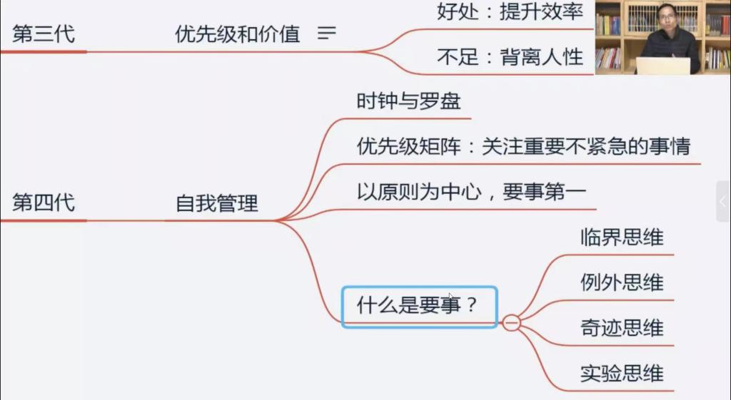 庄明科教授从时间管理、行为功能分析、习惯改变与养成、由习惯到精通:刻意练习,四个方面进行分析。当老师讲到第三代优先级和价值这个概念的时候,讲到好处是提升效率,而不足是背离人性。这不仅引人深思,虽是效率得到提升,但是我们真的是可以去背离人性吗?其次第四代的时间管理以自我管理为中心,能够通过一件事占据的重要程度而进行自我调整。