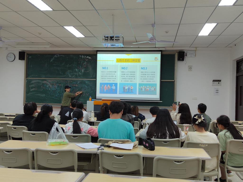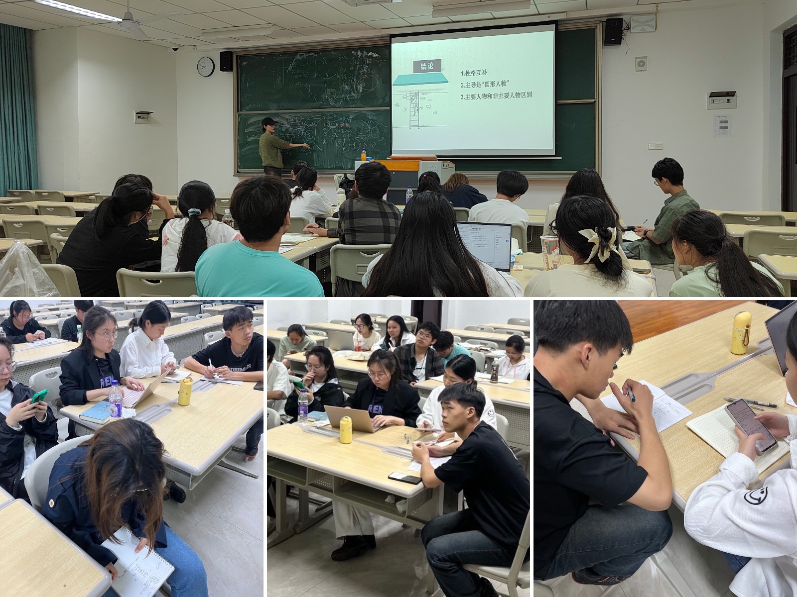 在设计小说人物时,作者既要为小说故事搭配不同类型的人物,进而建立起各具特征而又形象生动的人物系列,又要为故事中的人物系列配置结构性关系,并寻找到能够统领小说人物关系的“人物核”。苏老师讲解道:常见的人物关系设置有三种:第一,根据主人公的欲望取向配置小说中人物的结构性关系。格雷马斯把小说中的第一组功能性的人物类型分为主体(主人公)与客体(对象);第二,根据主人公行为的施受取向配置小说中人物的结构性关系。第二组功能性的人物类型分为施动者(授者)与受动者(受者);第三,根据人物与主人公的利害关系配置小说中人物的结构性关系。第三组的人物类型分为帮助者(助手)与阻挠者(对手)。在讲完基础知识后,苏老师结合蔡佳卿同学的小说《盲》,开始分析并逐步协助我们完善此小说中的角色界定。当然这只是构想之一,苏老师说具体如何写还是靠我们自己,她只是帮我们打开思路。由于这学期同学们都写出了小说初稿,因此苏老师在讲授创作理论知识的同时,将重点放在了从我们的作品出发,在写作实践中协助大家芜存菁、创新补阙。